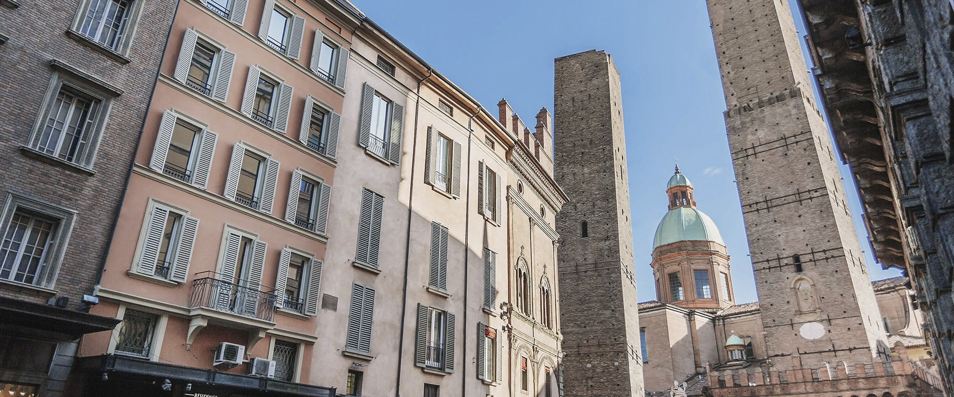 6 apartments on 6 floors, all linked by an elevator, each one decorated with great attention to details and characterized by intense colors and elegant furnishings. All apartments overlook Via Rizzoli, Bologna’s principal street, giving guests an exclusive view of the Two Towers, the most symbolic monument of the city.