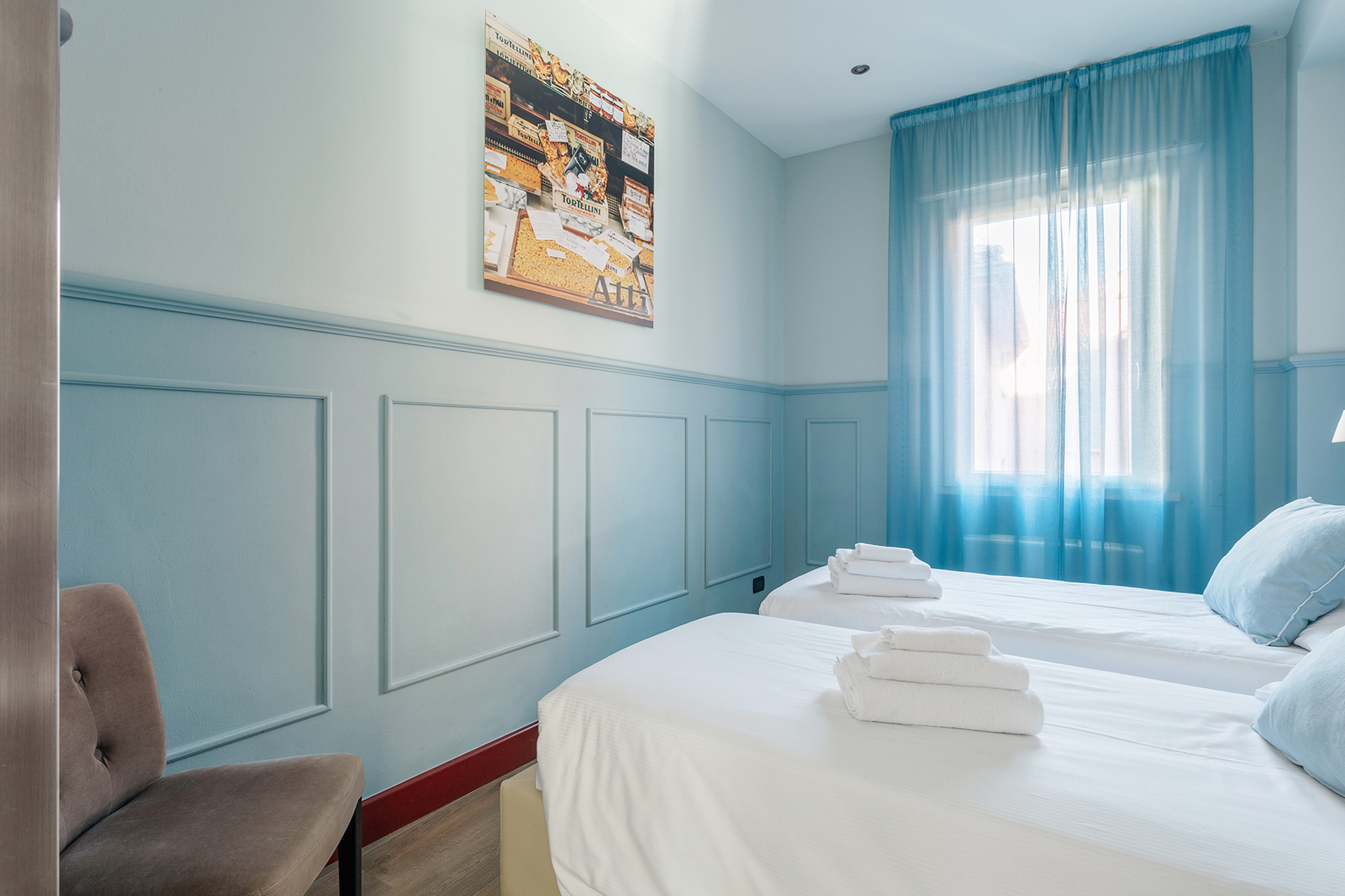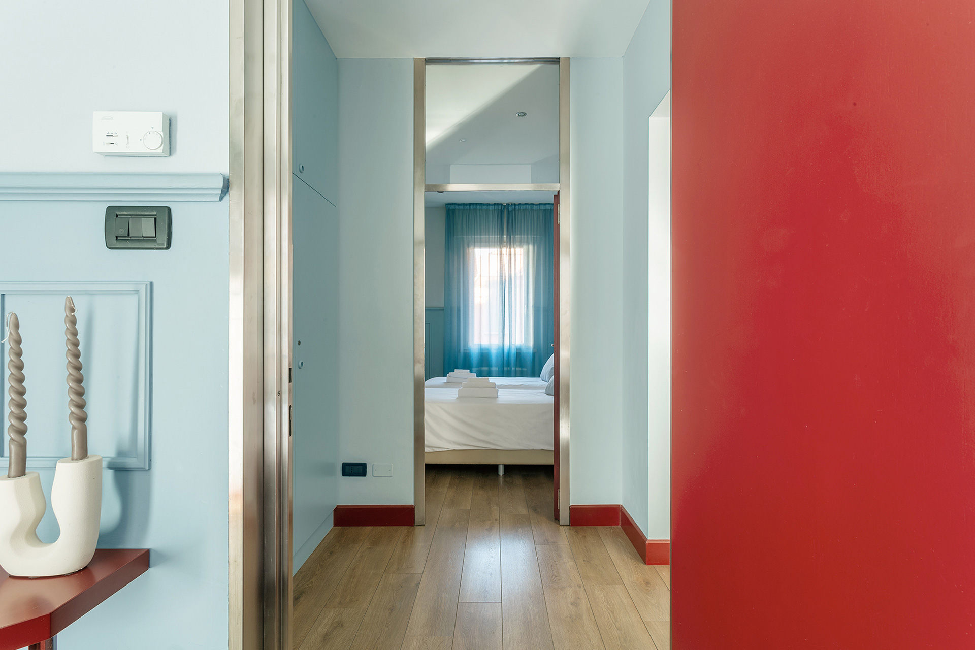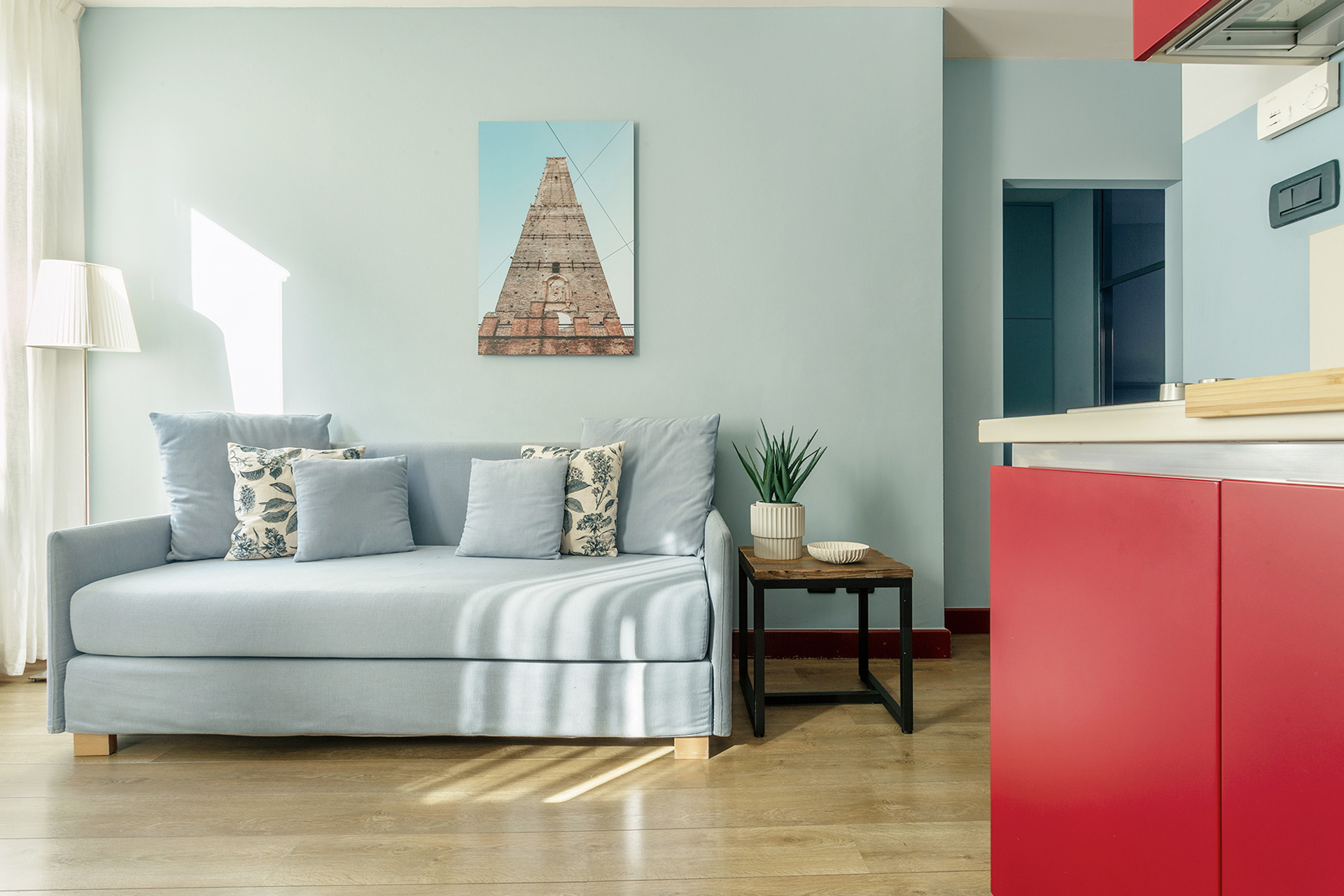 A bright three-room apartment, located at Petronio Residence on via Rizzoli 38, tastefully furnished, with blue walls and hardwood floor.
