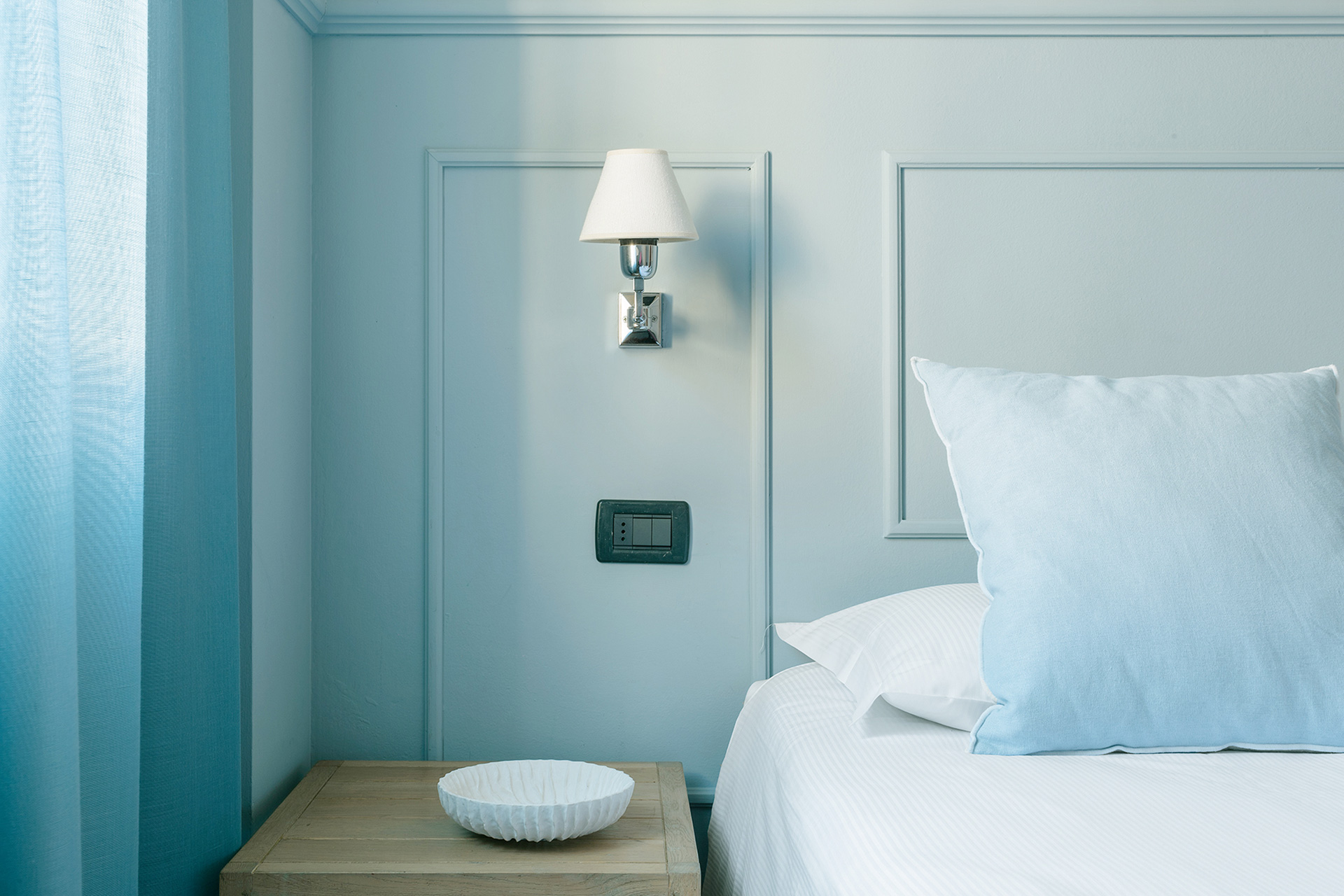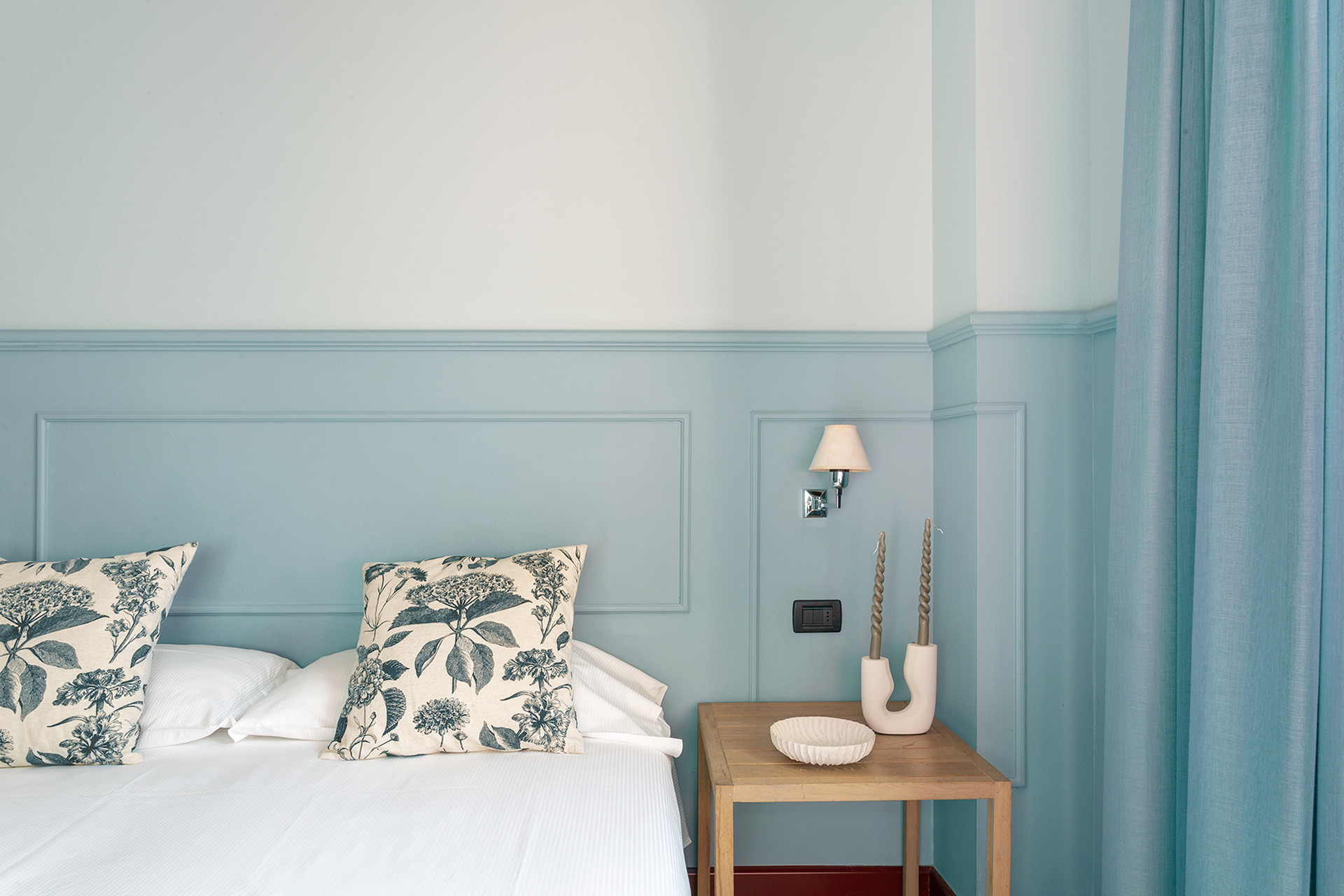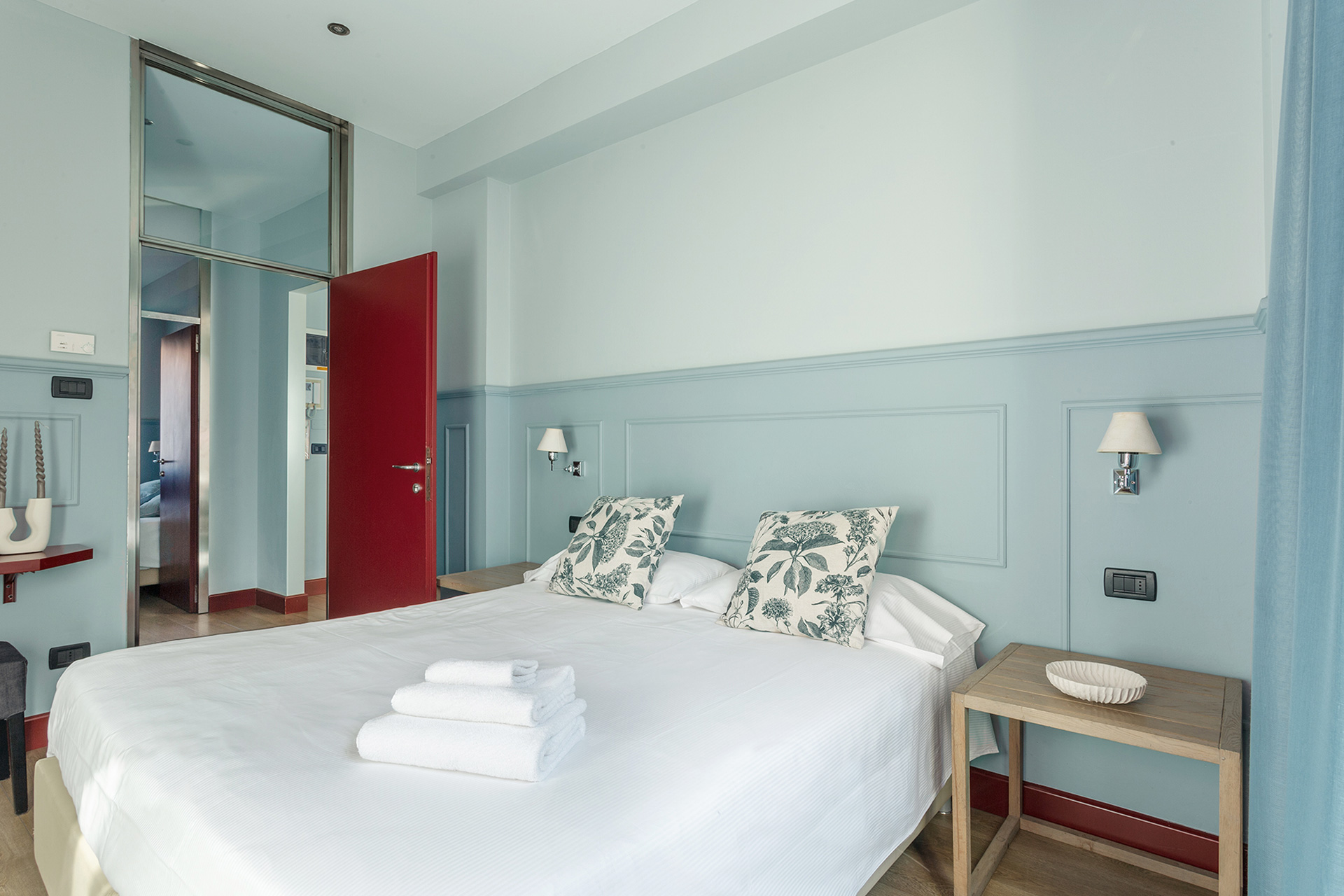 A bright three-room apartment, located at Petronio Residence on via Rizzoli 38, tastefully furnished, with blue walls and hardwood floor.