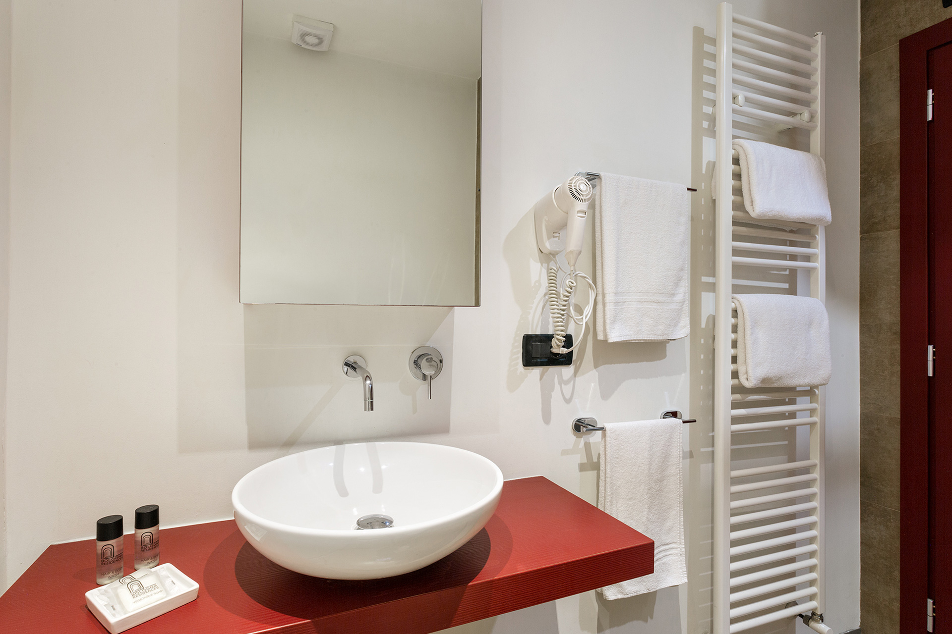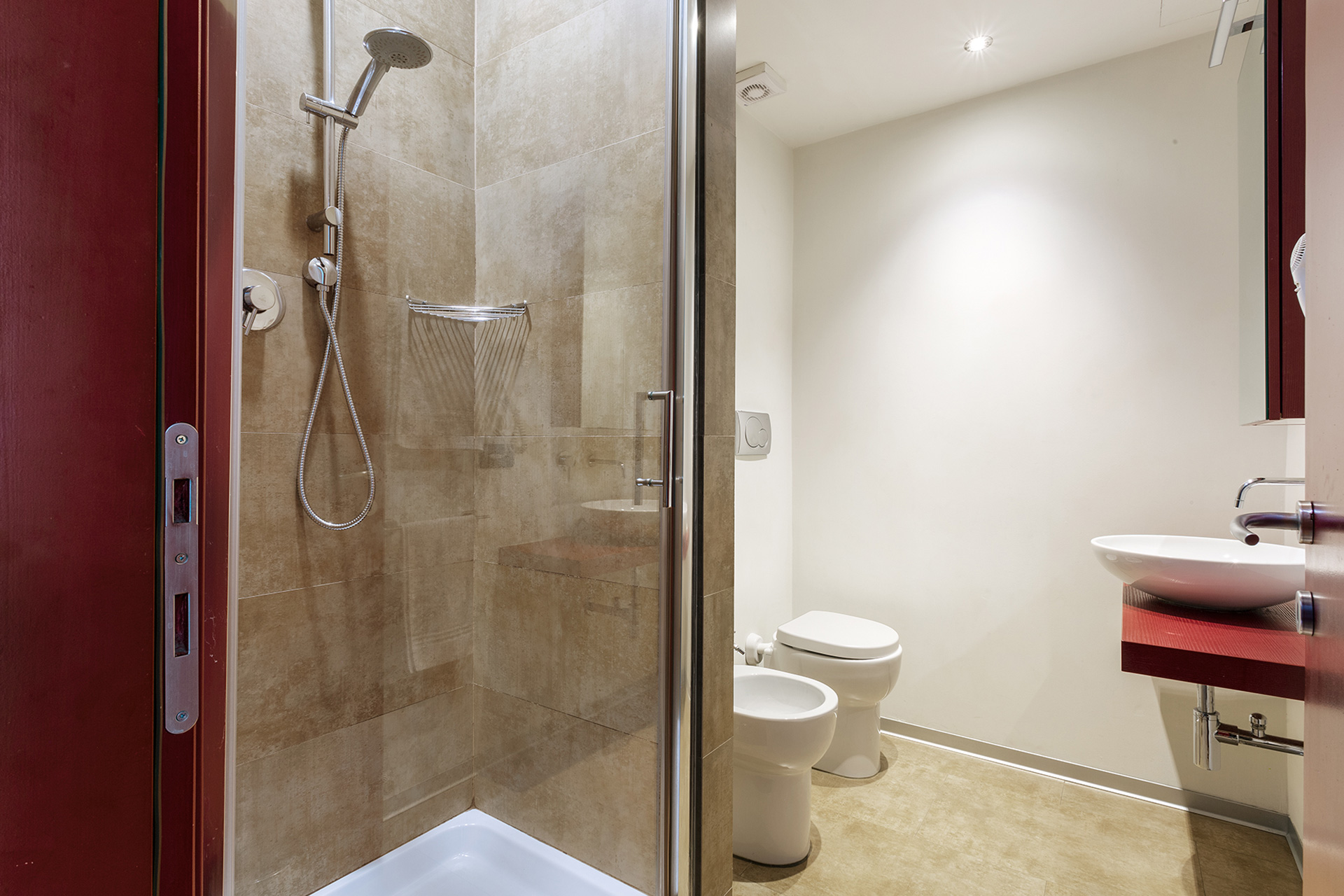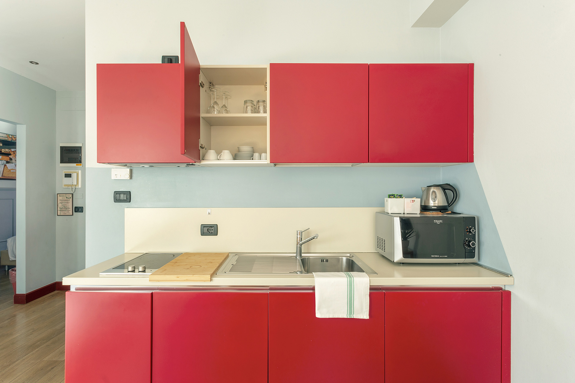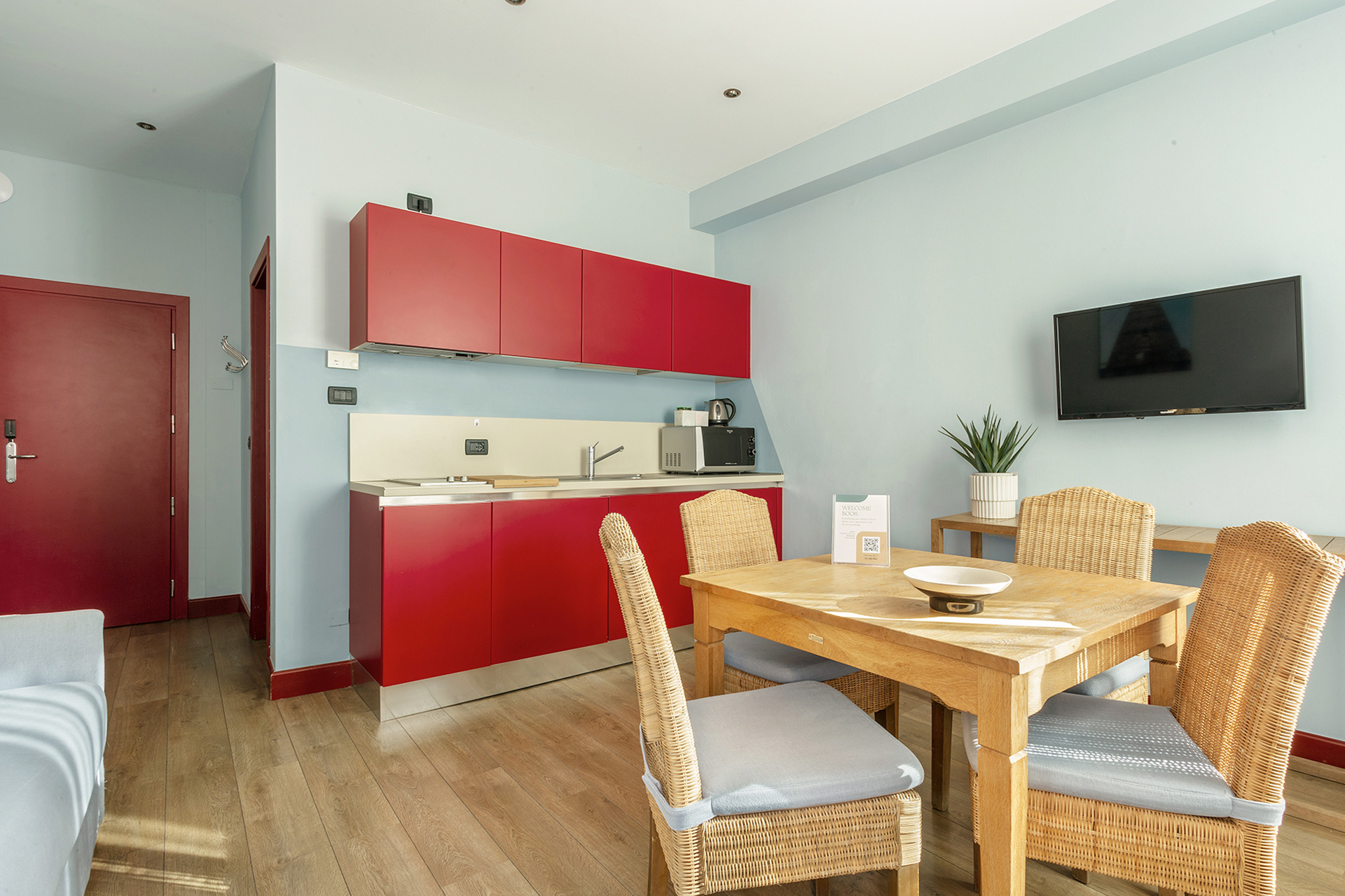 Two large windows light up the living area, which consists of a kitchenette with two electric hotplates, a fridge, a microwave oven, an electric kettle and a dishwasher. The room is featured with a dining table and a comfortable sofa, that can be easily turned into a single bed, if necessary.