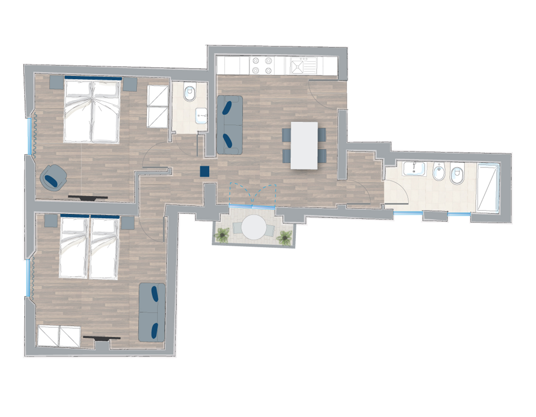 The living area is composed by a cozy sitting room with a sofa and a windowed bathroom with shower. The dining area, for up to five people, is lit by a French door leading to a private balcony with table and chairs.