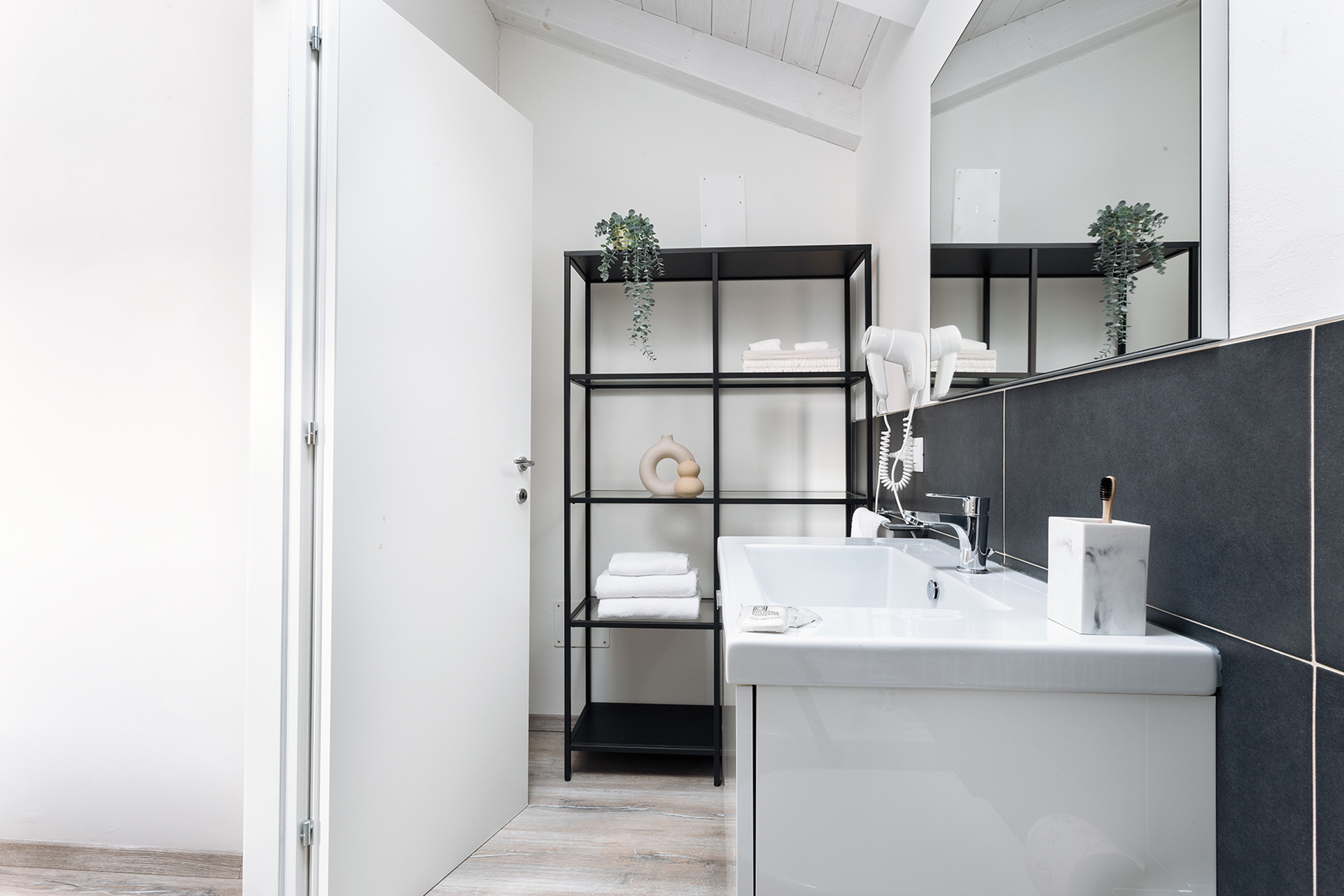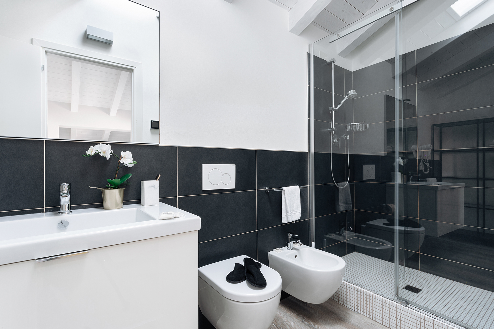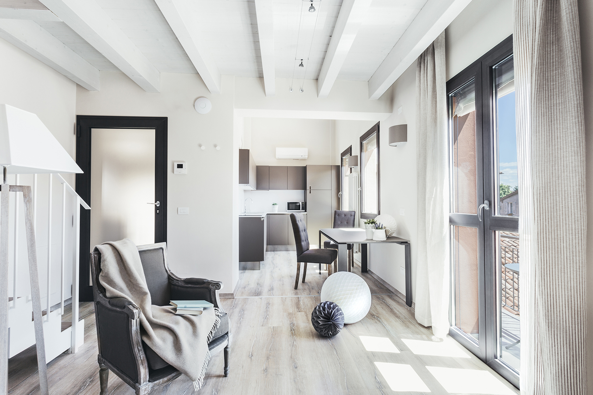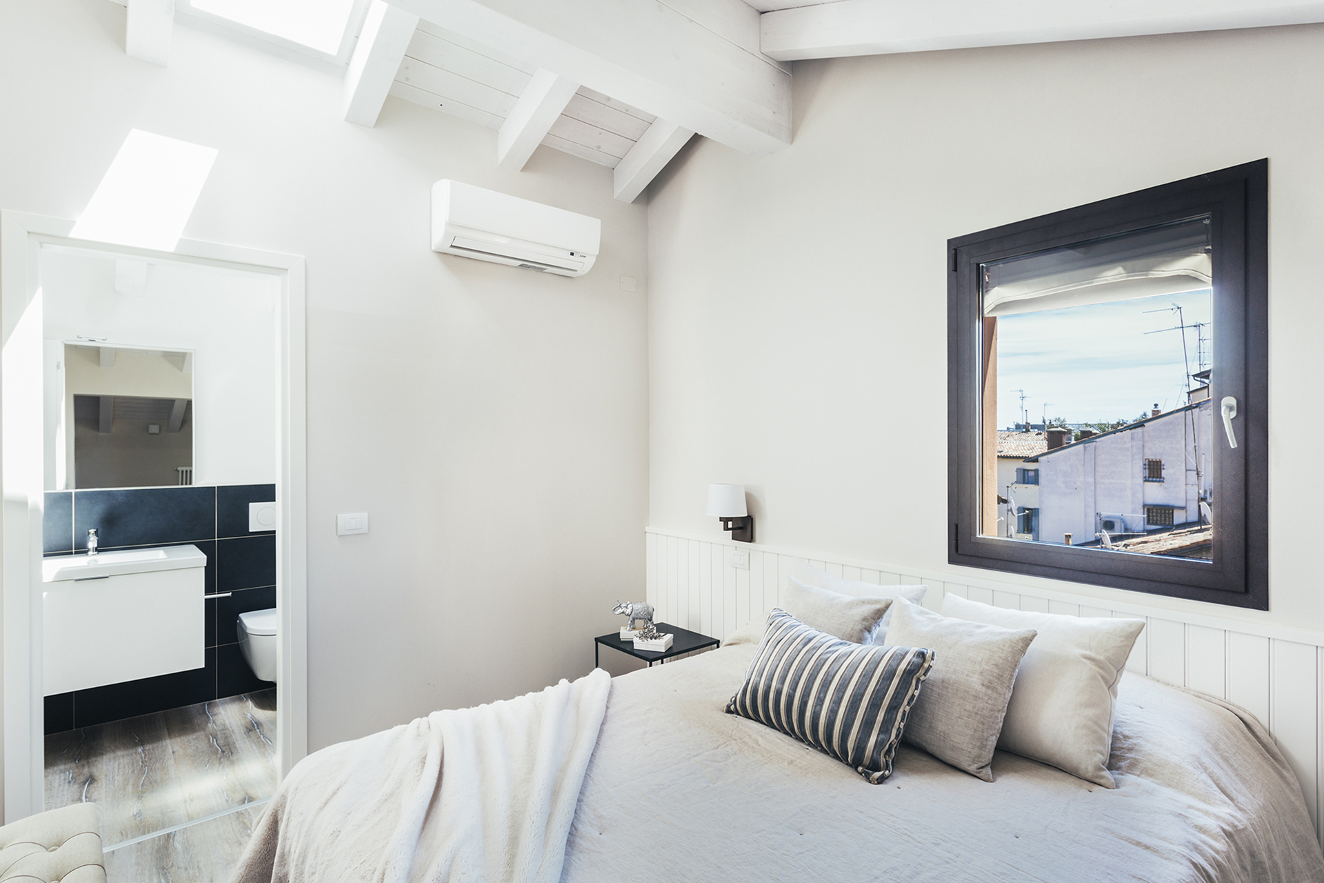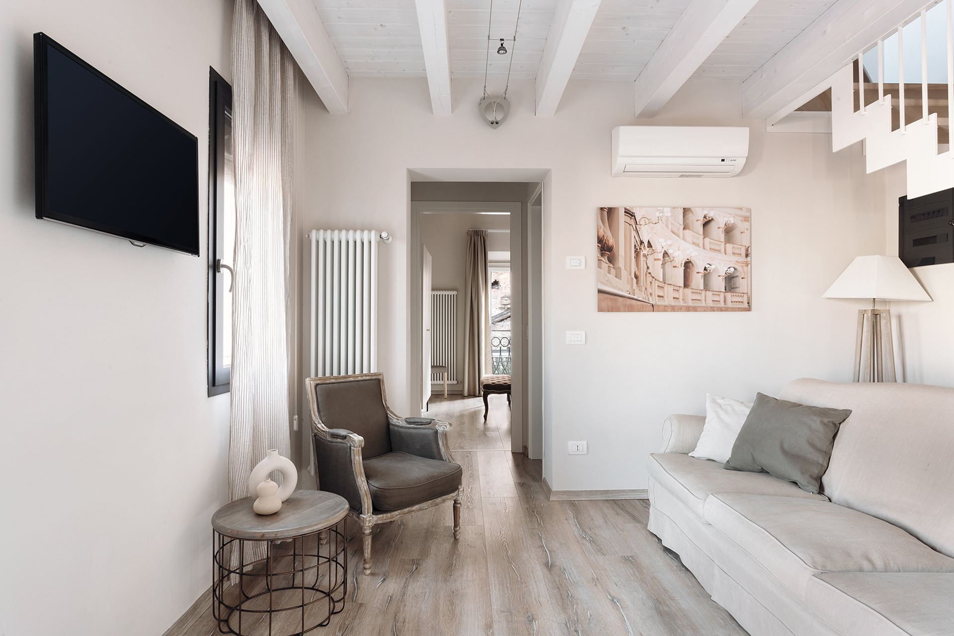 The living area, on the lower floor, is composed by a sitting room with a cozy sofa and a dining table, and a French window gives access to a small picturesque balcony with a table and two chairs with a wonderful view on the Bologna’s rooftops.