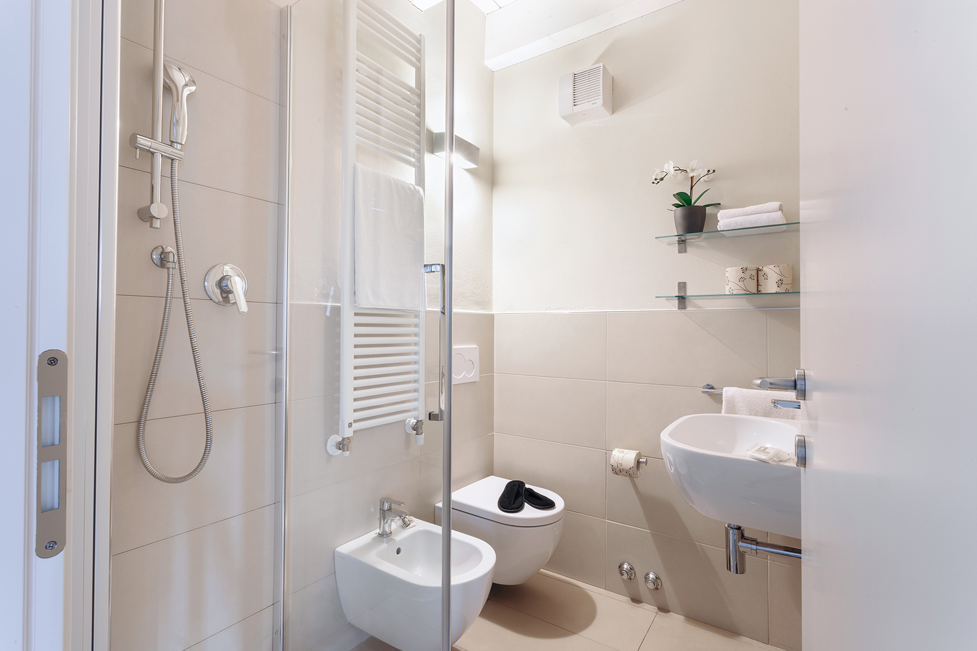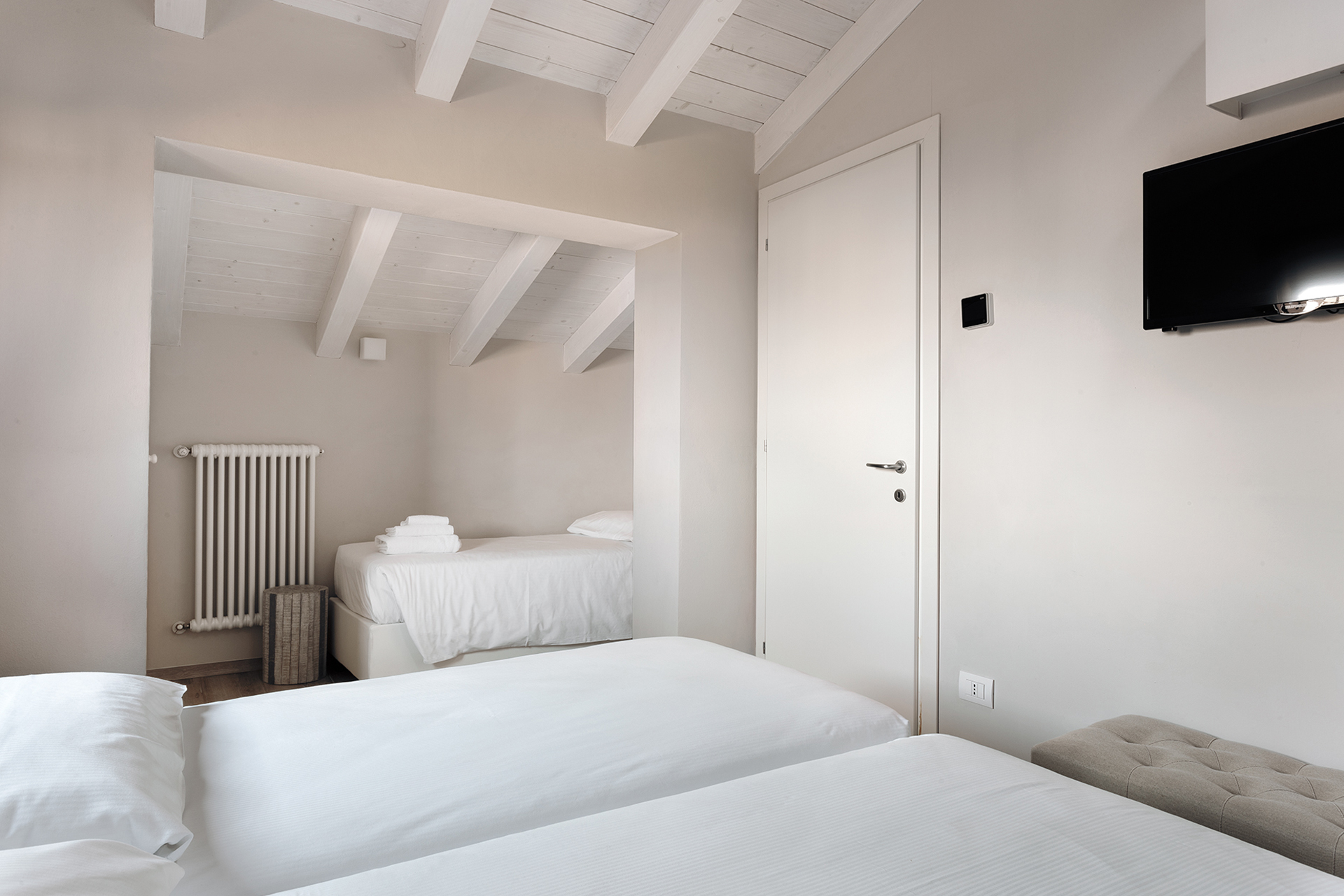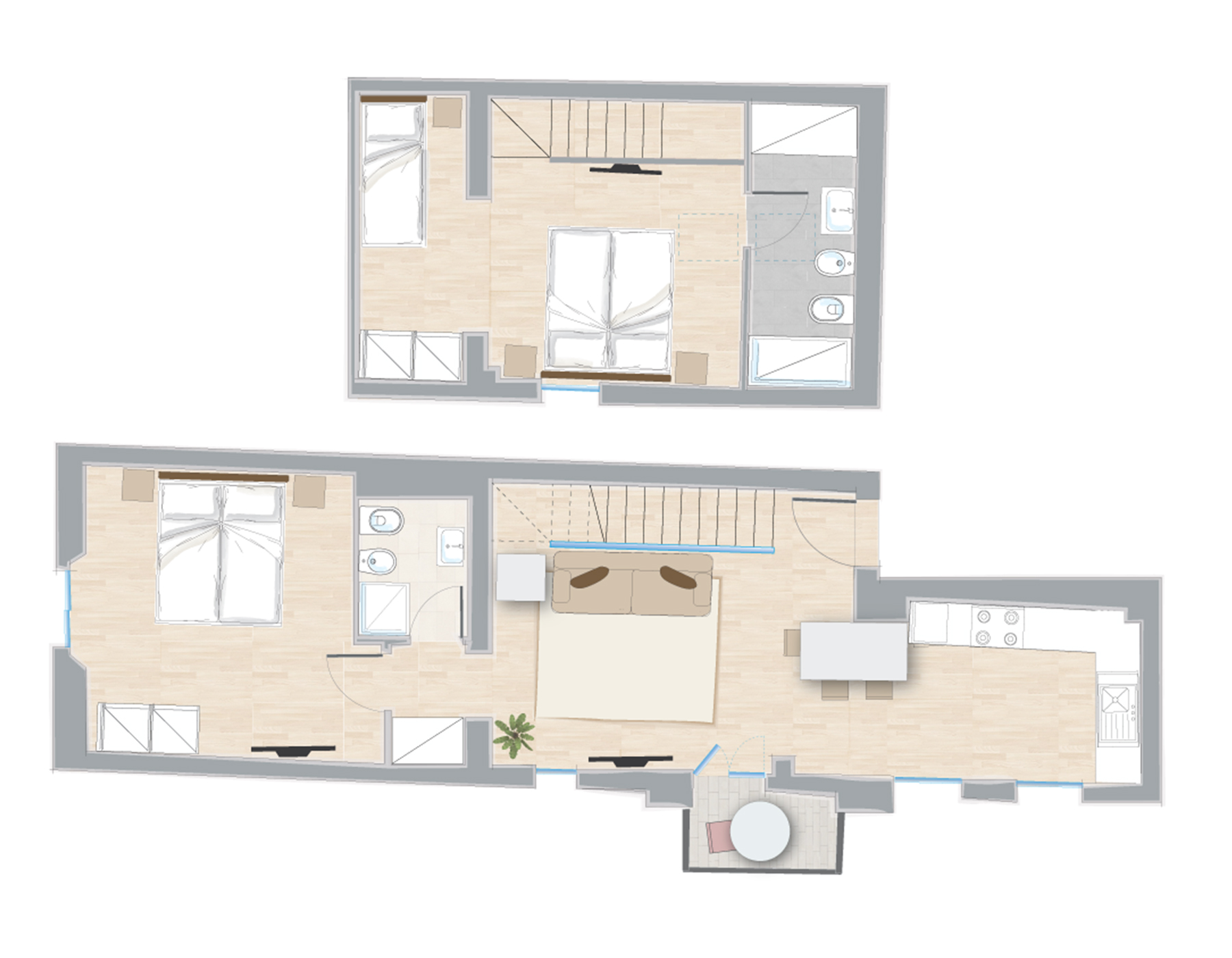 The sleeping area consists of two bedrooms. The first one, on the lower floor, is a double bedroom with a large window overlooking the church of Santa Maria dei Servi. The second is at the upper floor and has two singles beds plus another single bed. They both have a bathroom with shower.