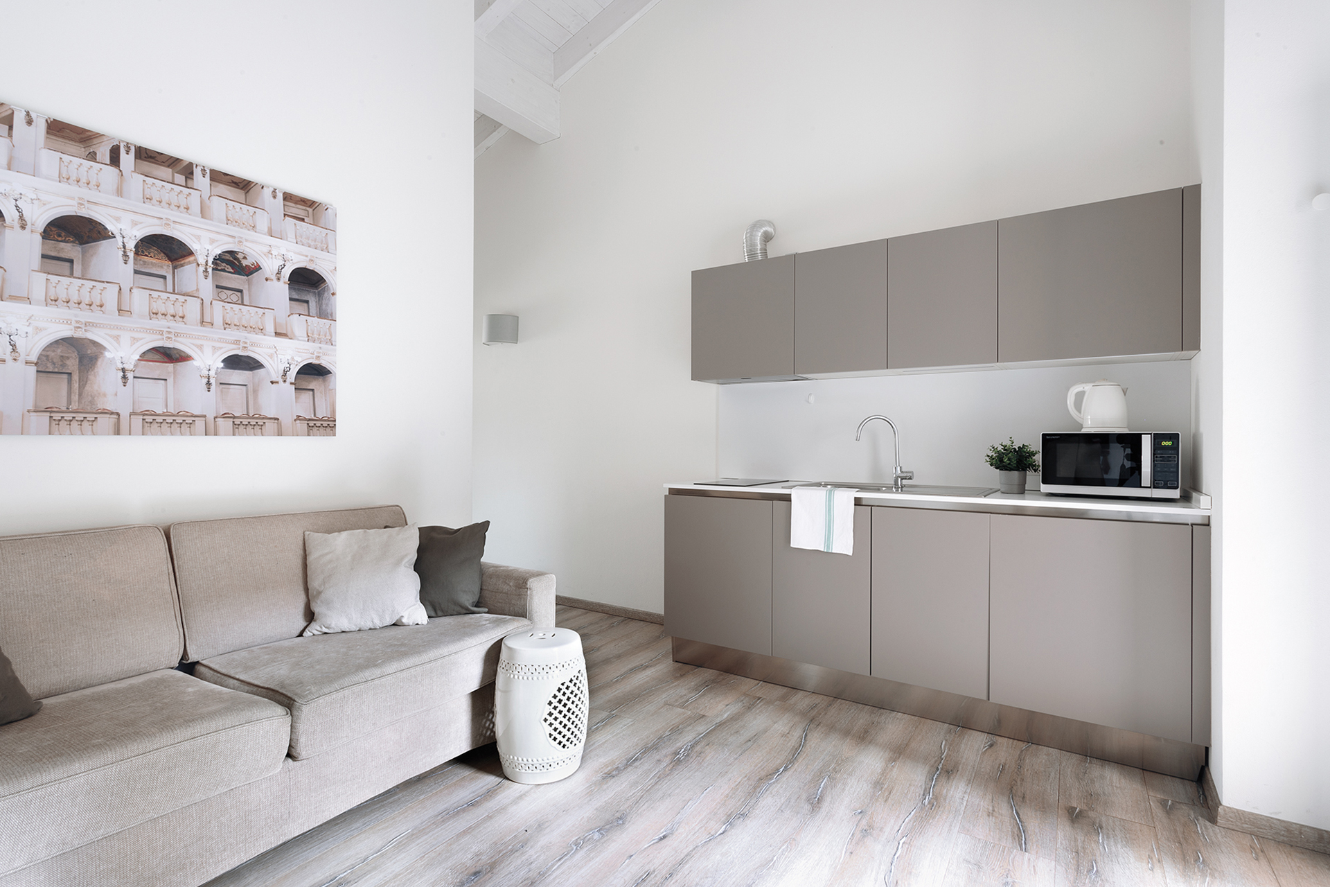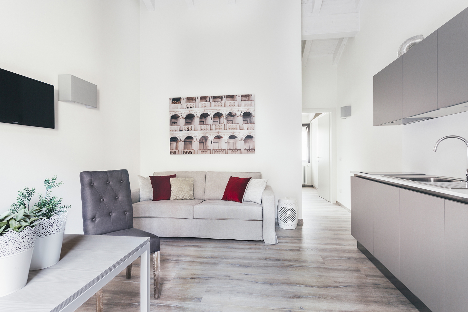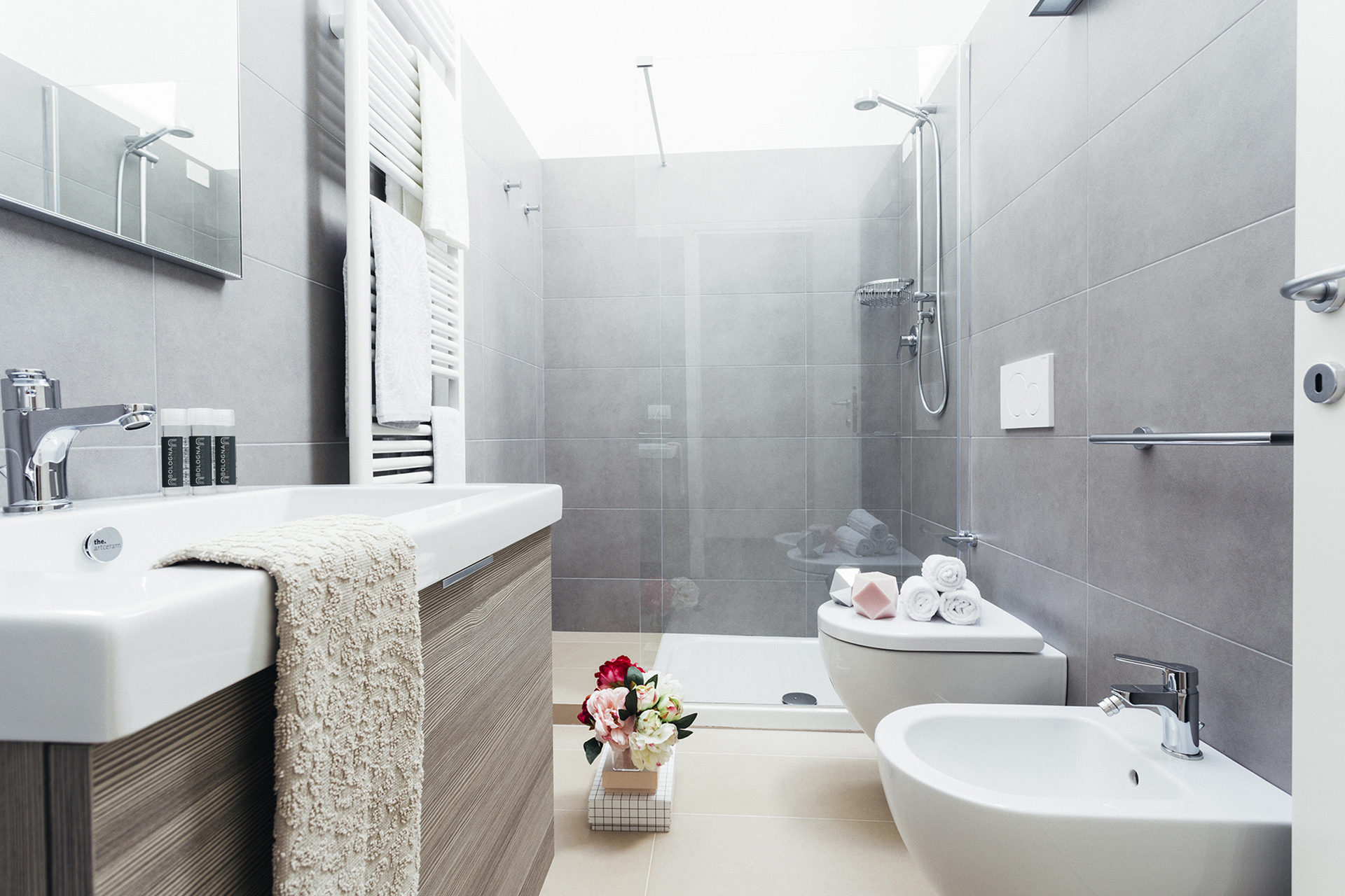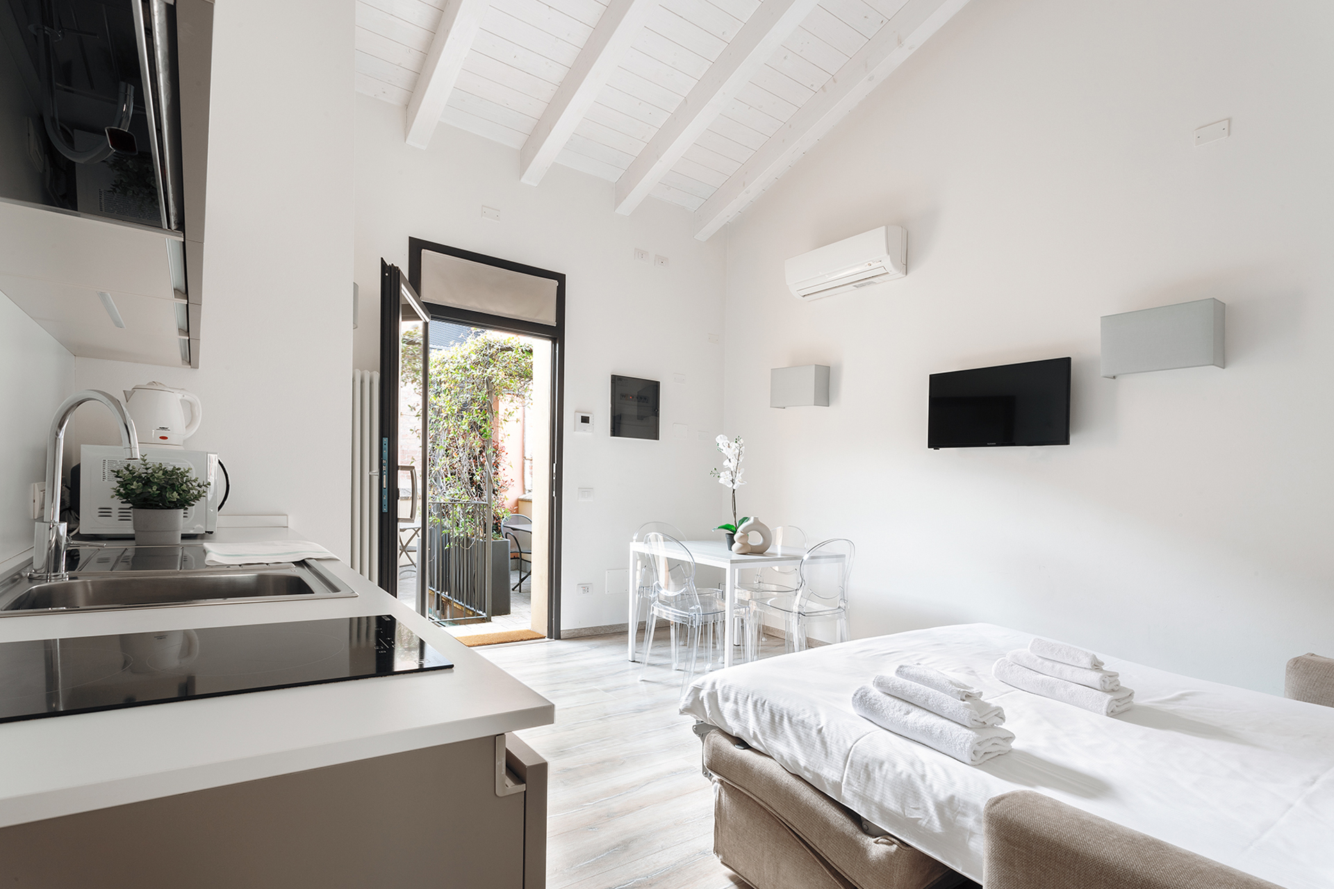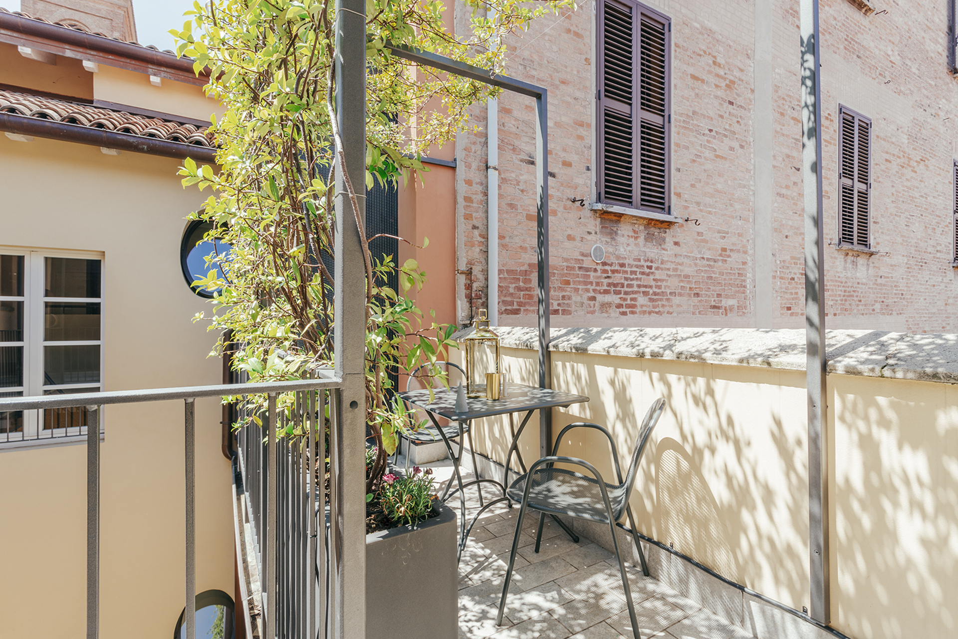 A bright two-room apartment with a private balcony with table and chairs, located at Opera Residence on Strada Maggiore 52.