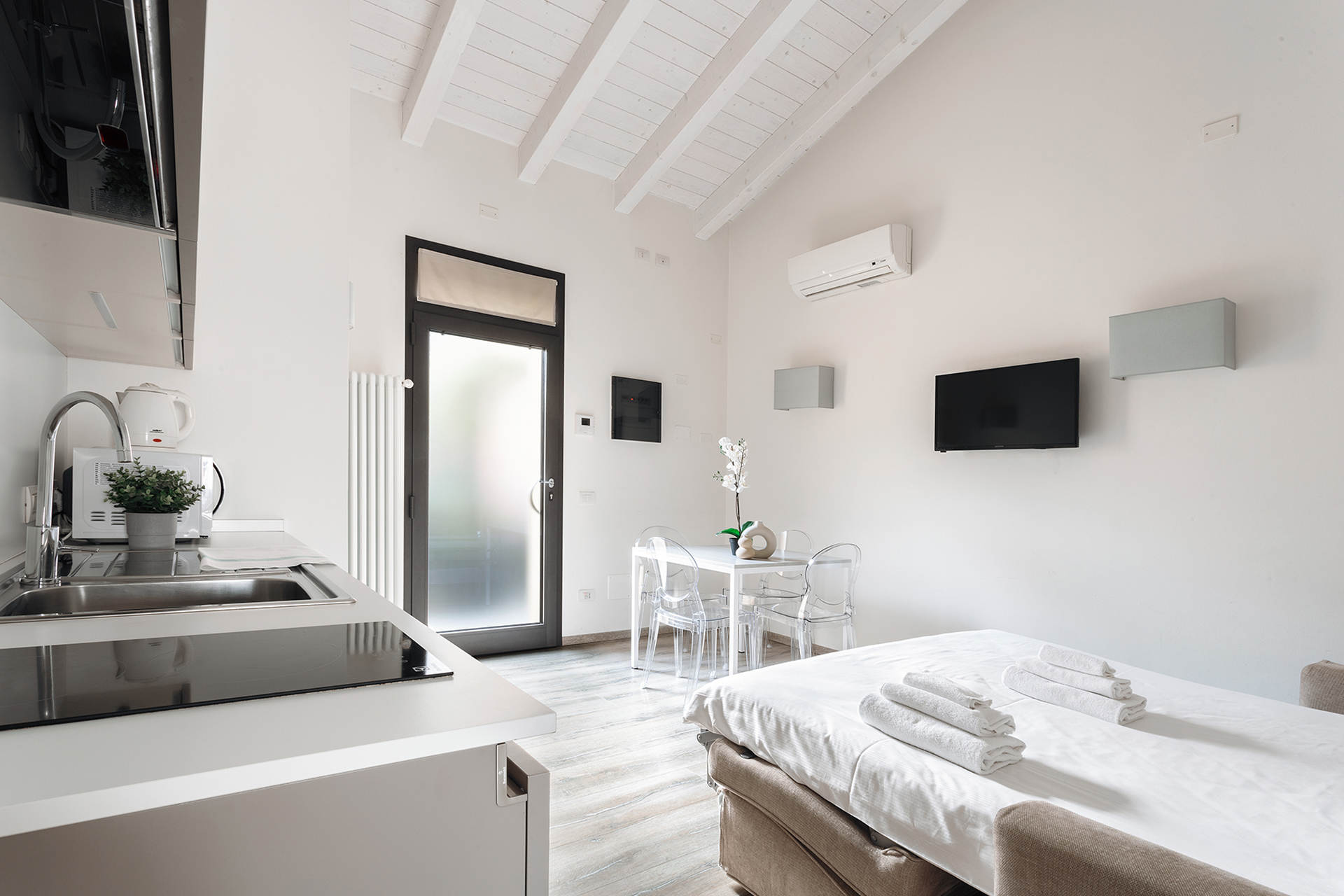 The living area includes a double sofa bed and a four person dining table. The equipped kitchenette features induction cookers, refrigerator with freezer, microwave oven, dishwasher and electric kettle.