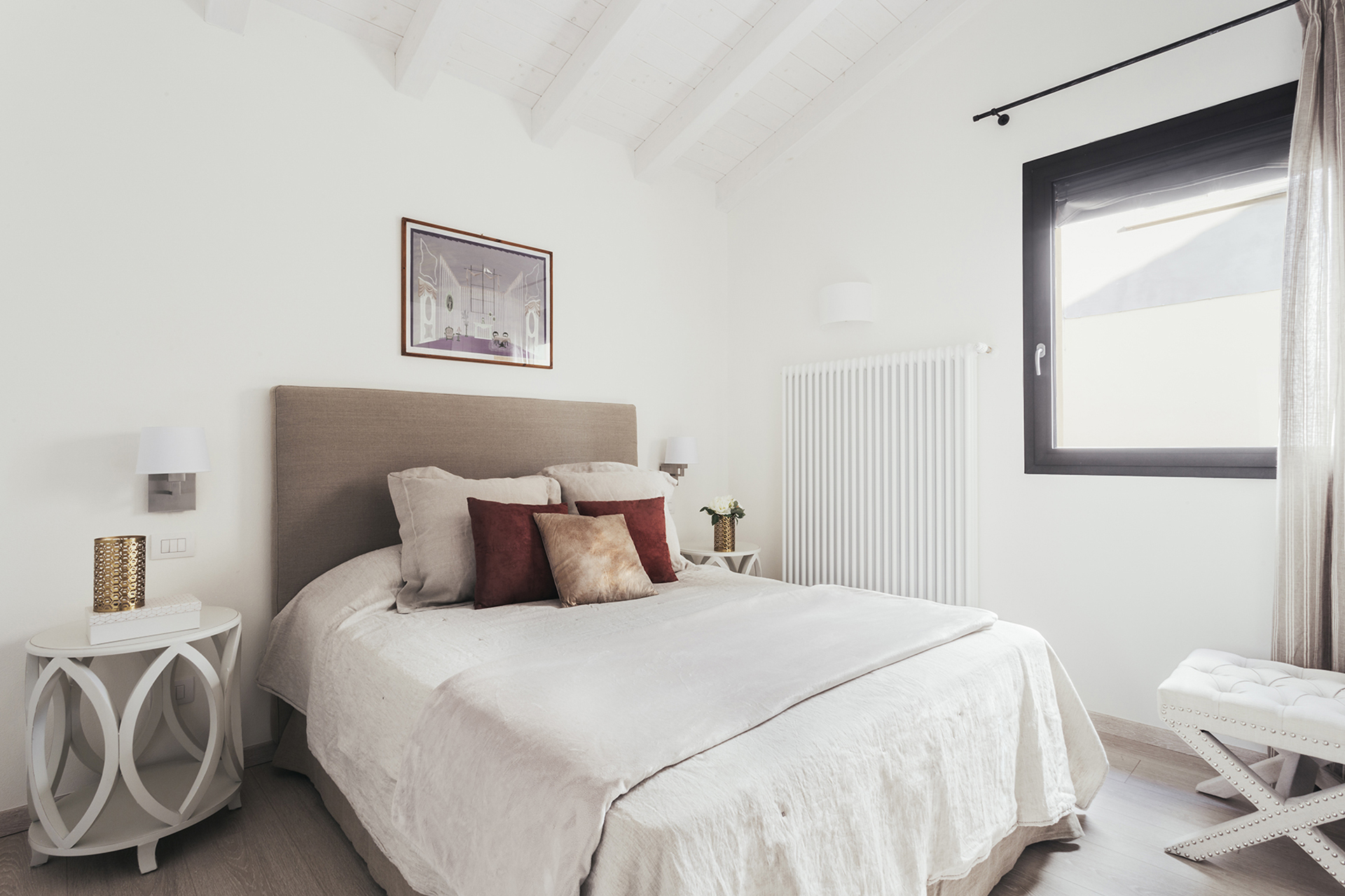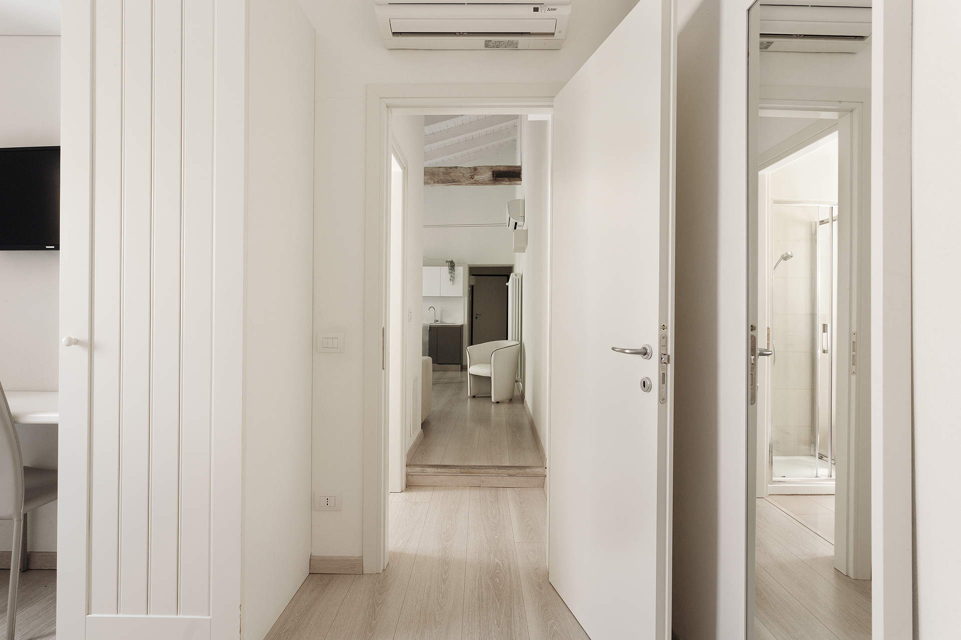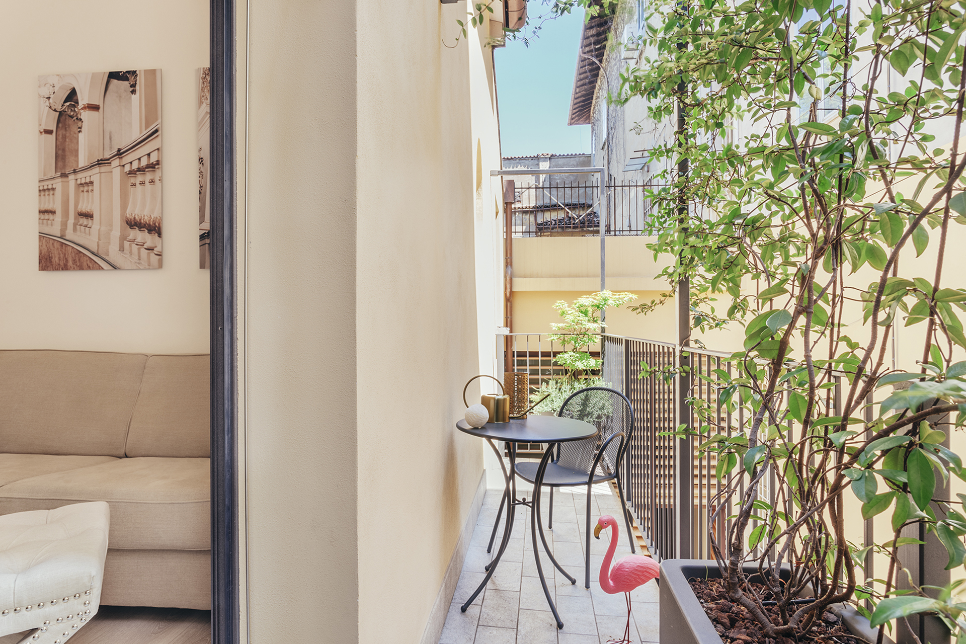 A French door gives access to a wide balcony with table and chairs.