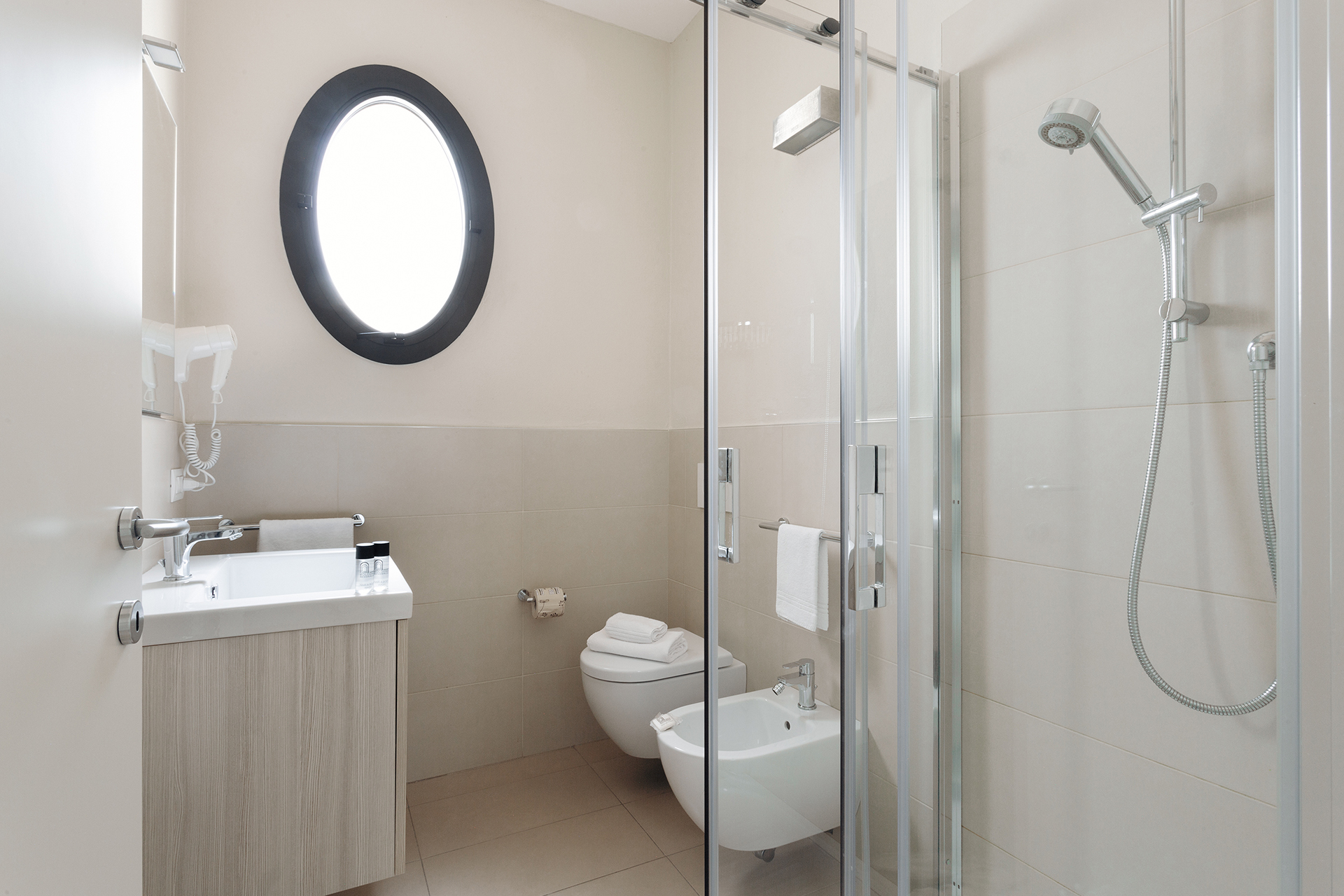 The sleeping area features a double bedroom and a bathroom with a large shower.