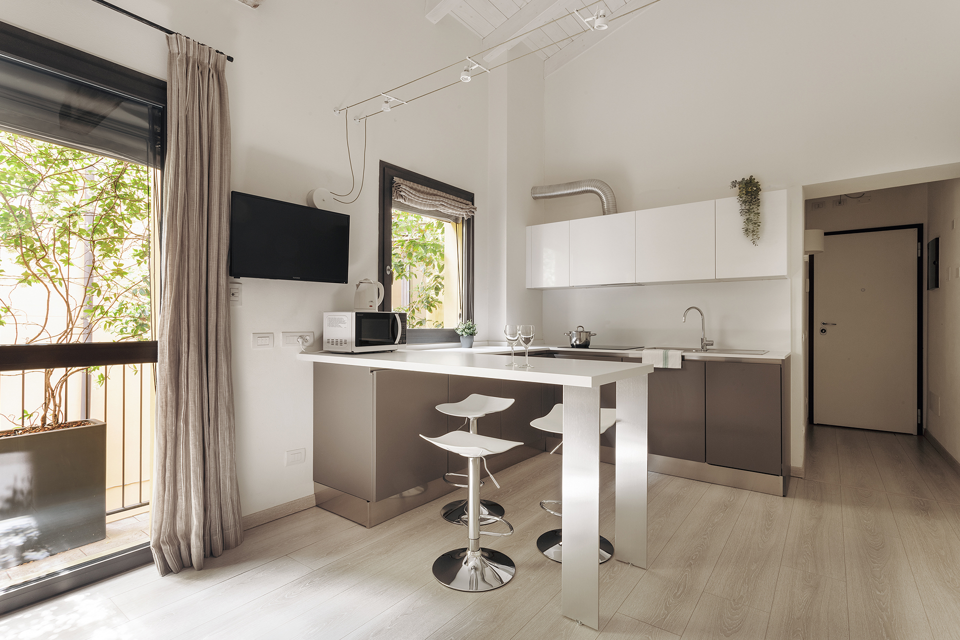 The living area includes a counter kitchenette equipped with induction cookers, a refrigerator with freezer, a microwave oven, a dishwasher and an electric kettle; as well as a double sofa bed and an armchair.