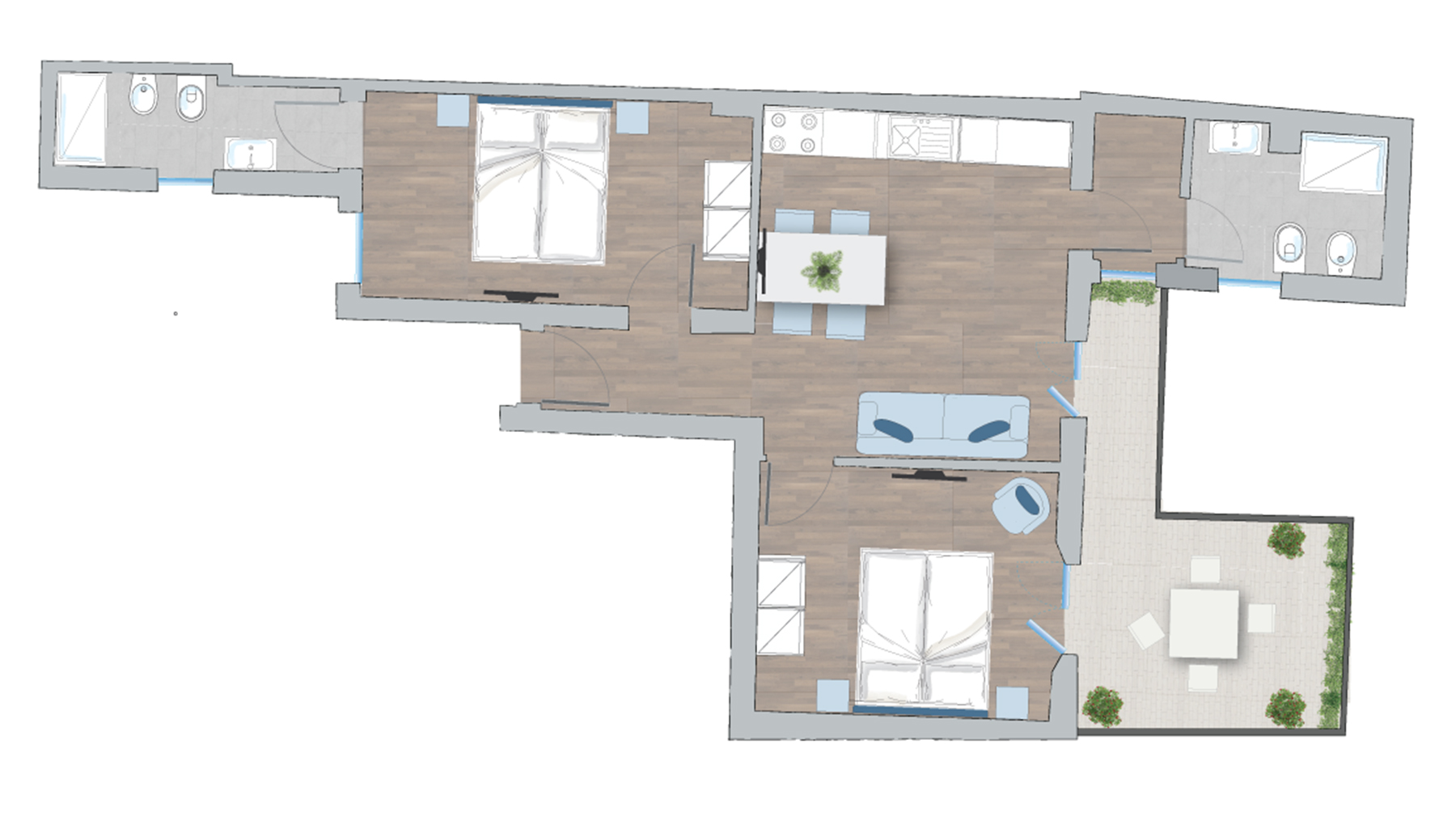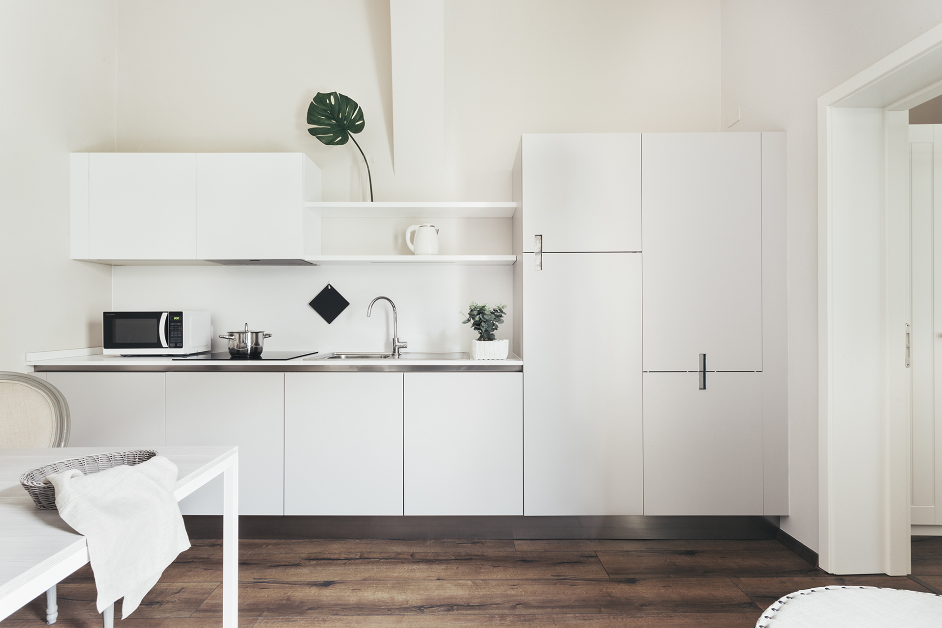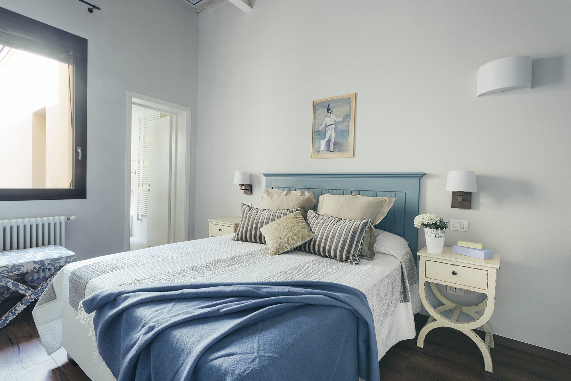 The living area consists of a cozy sitting room with a double sofa bed and a bathroom with shower. The dining area can accommodate up to six people and a French door allows plenty of natural light in the room, and leads to a furnished terrace with table and chairs, surrounded by Bologna’s typical rooftops.