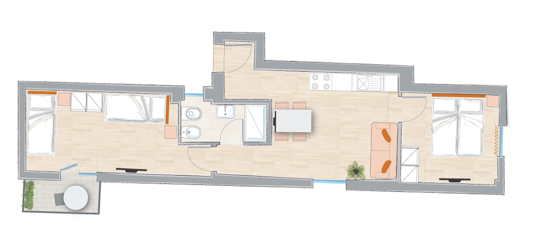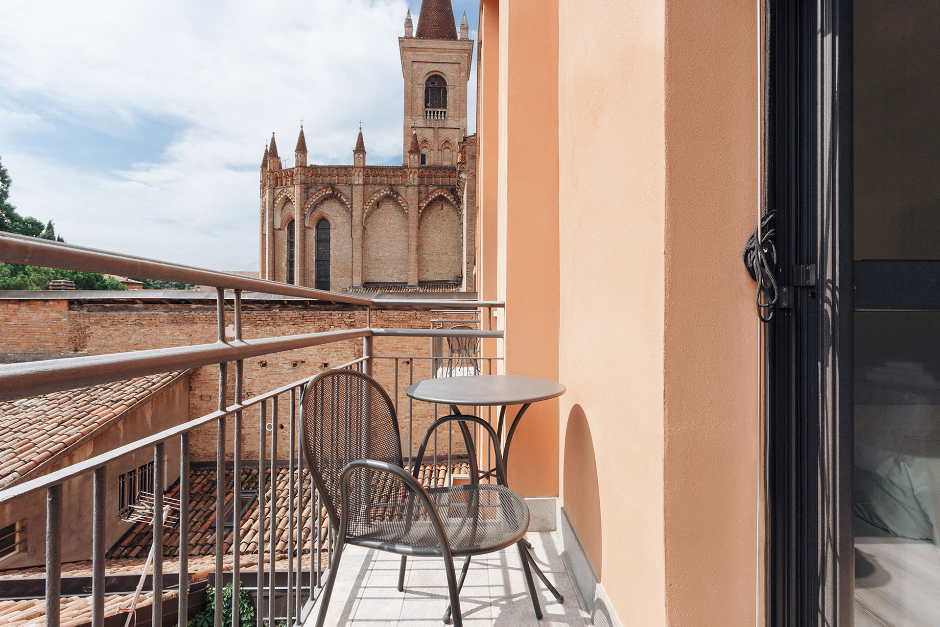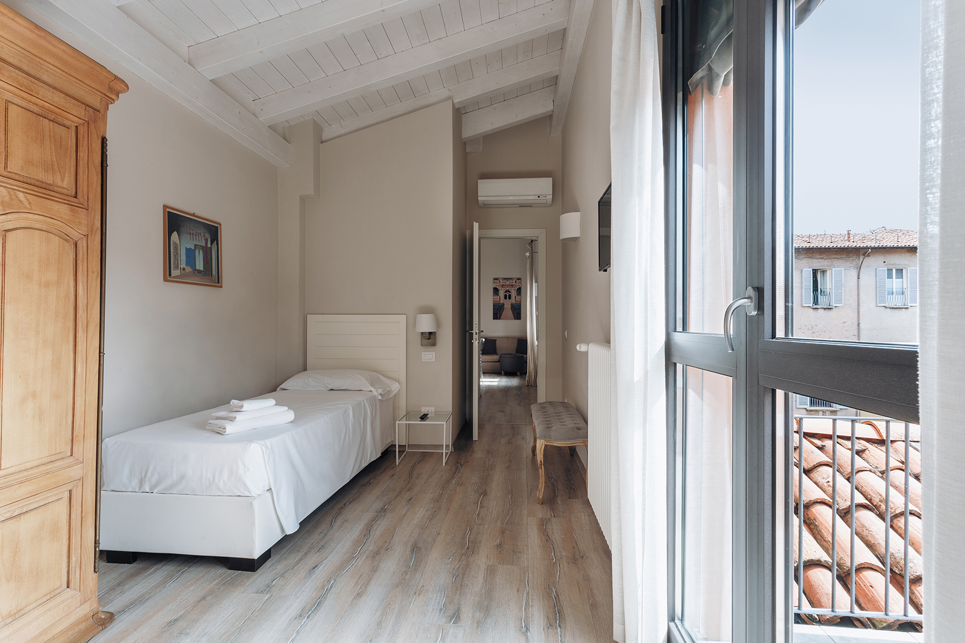 The sleeping area consists of two bedrooms: a double room with views of the typical Bolognese roofs , and one with two single beds with access to a balcony with a view of the Chiesa dei Servi .
