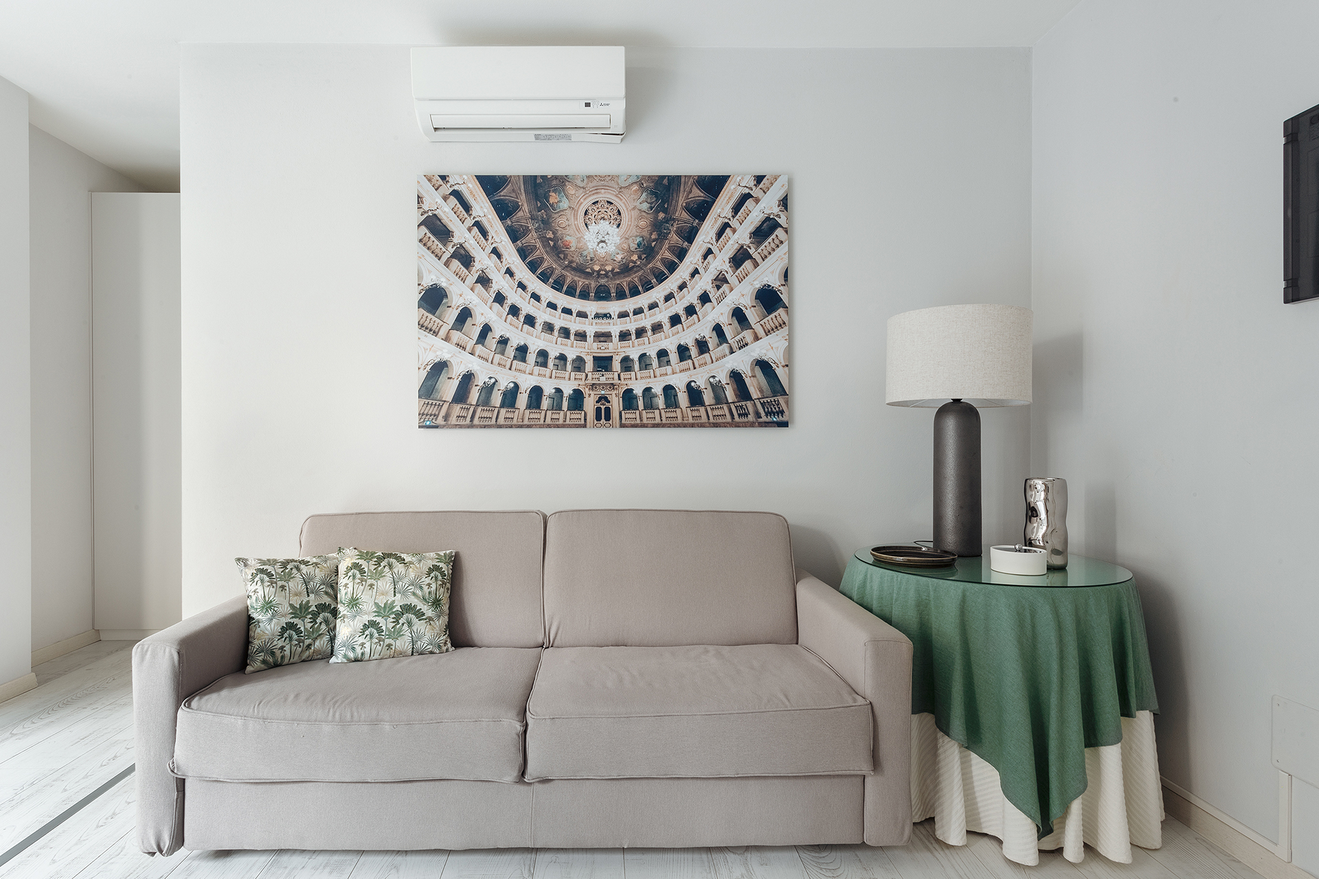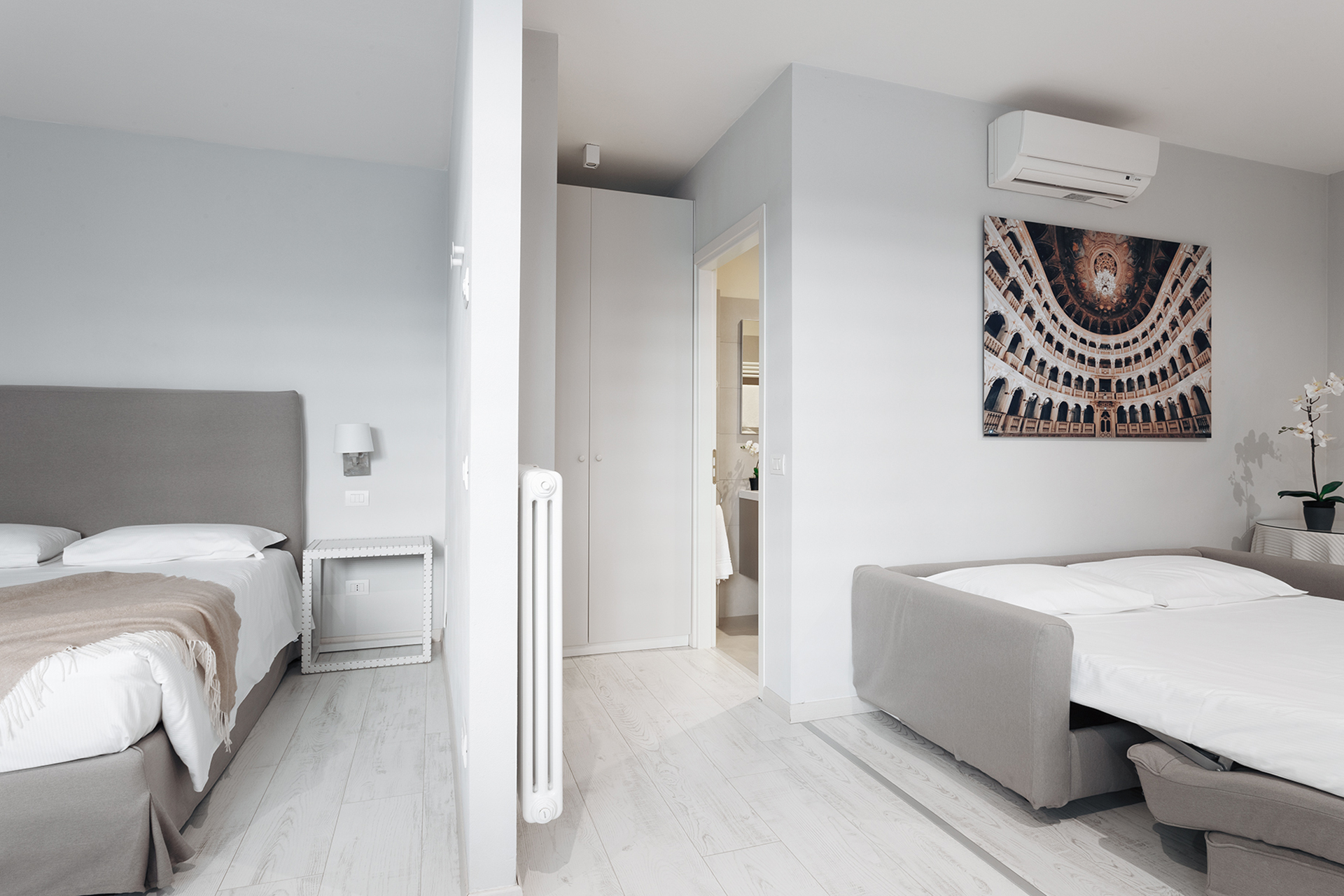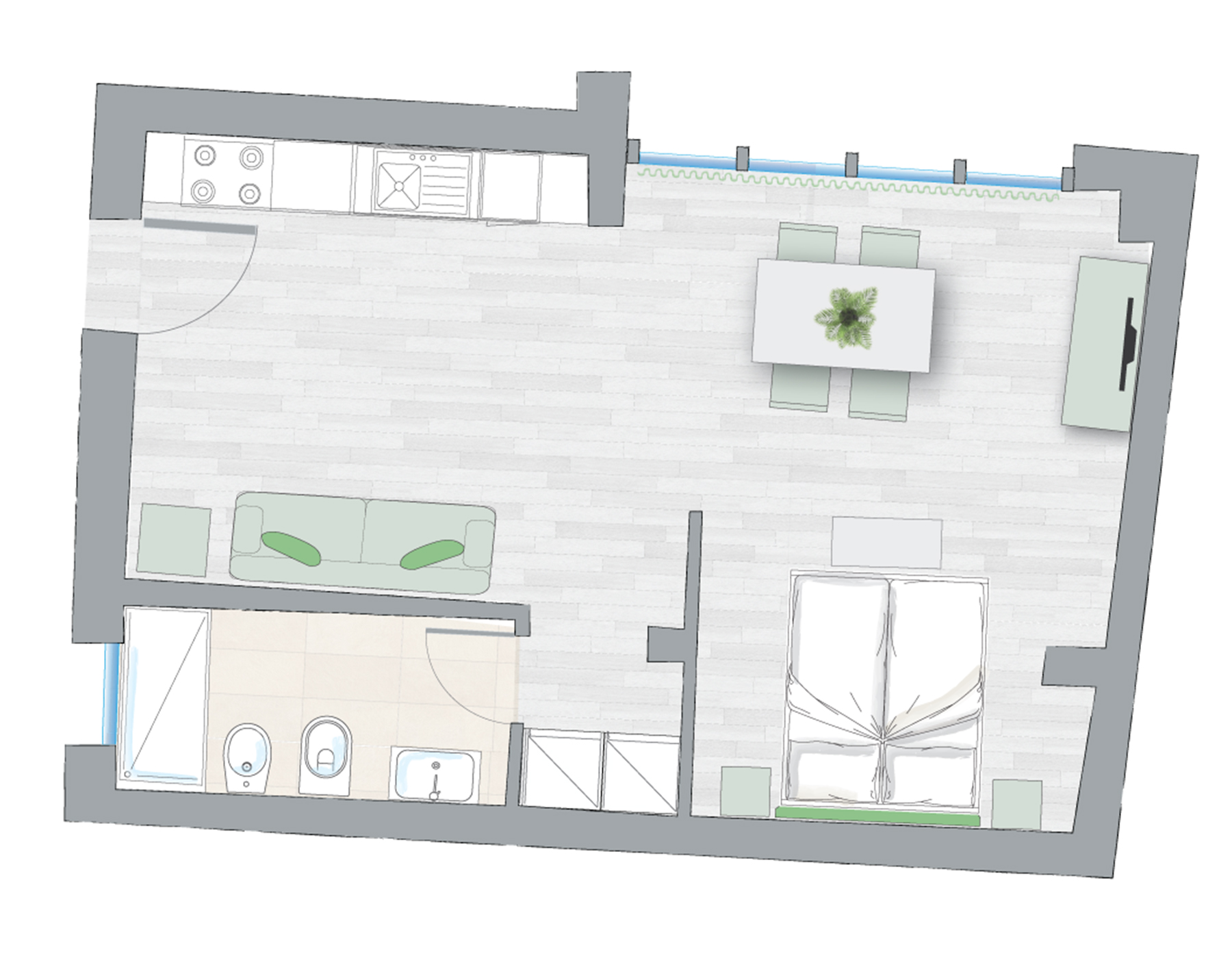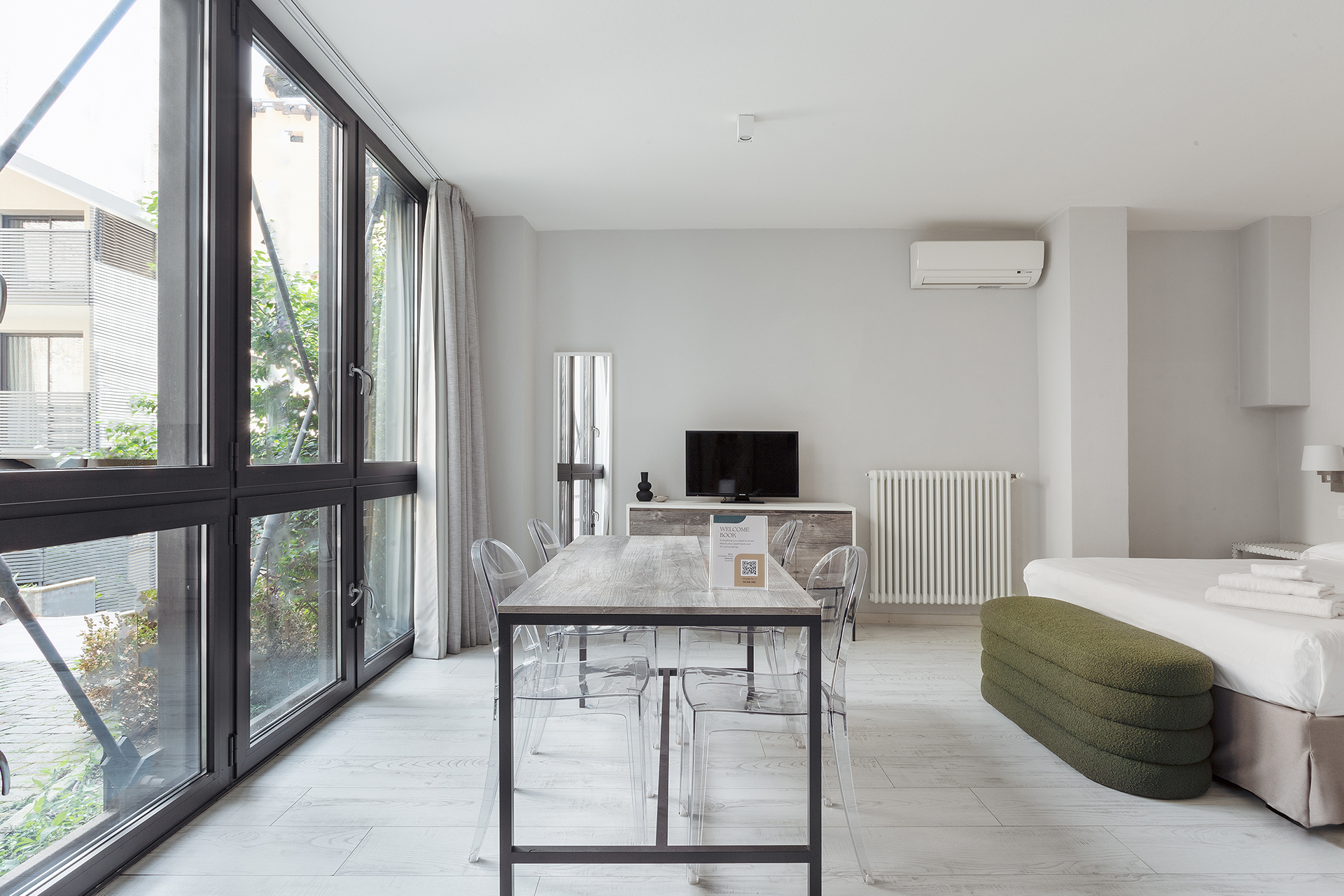 A spacious studio apartment located on the ground floor, with a French window overlooking the internal courtyard.