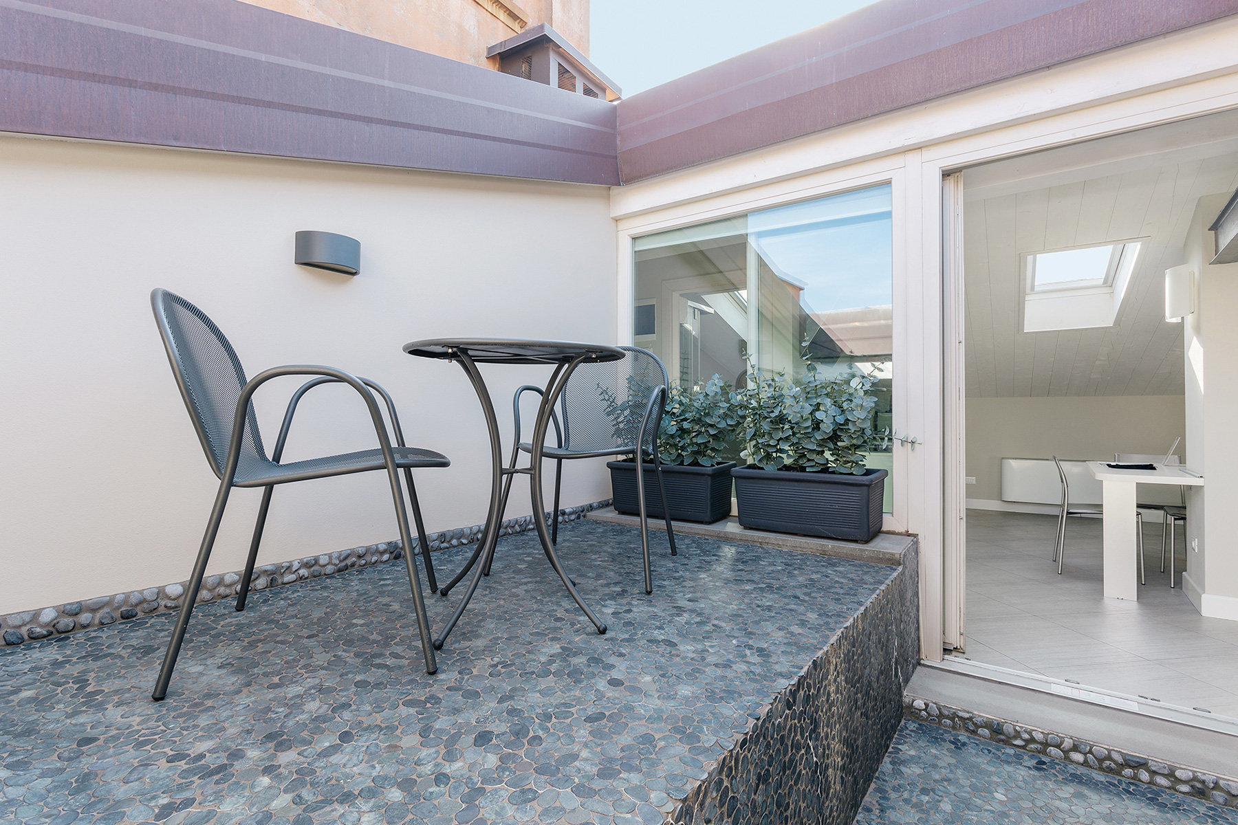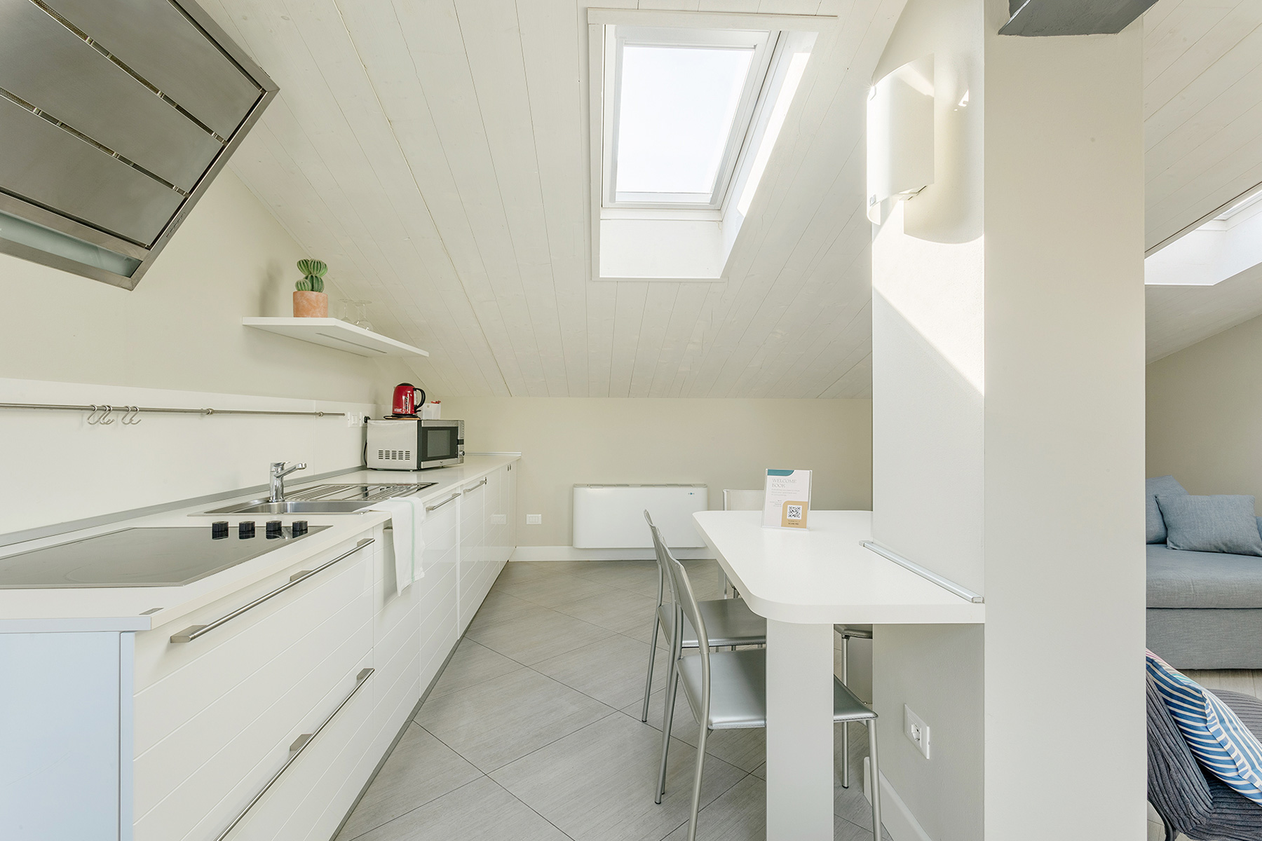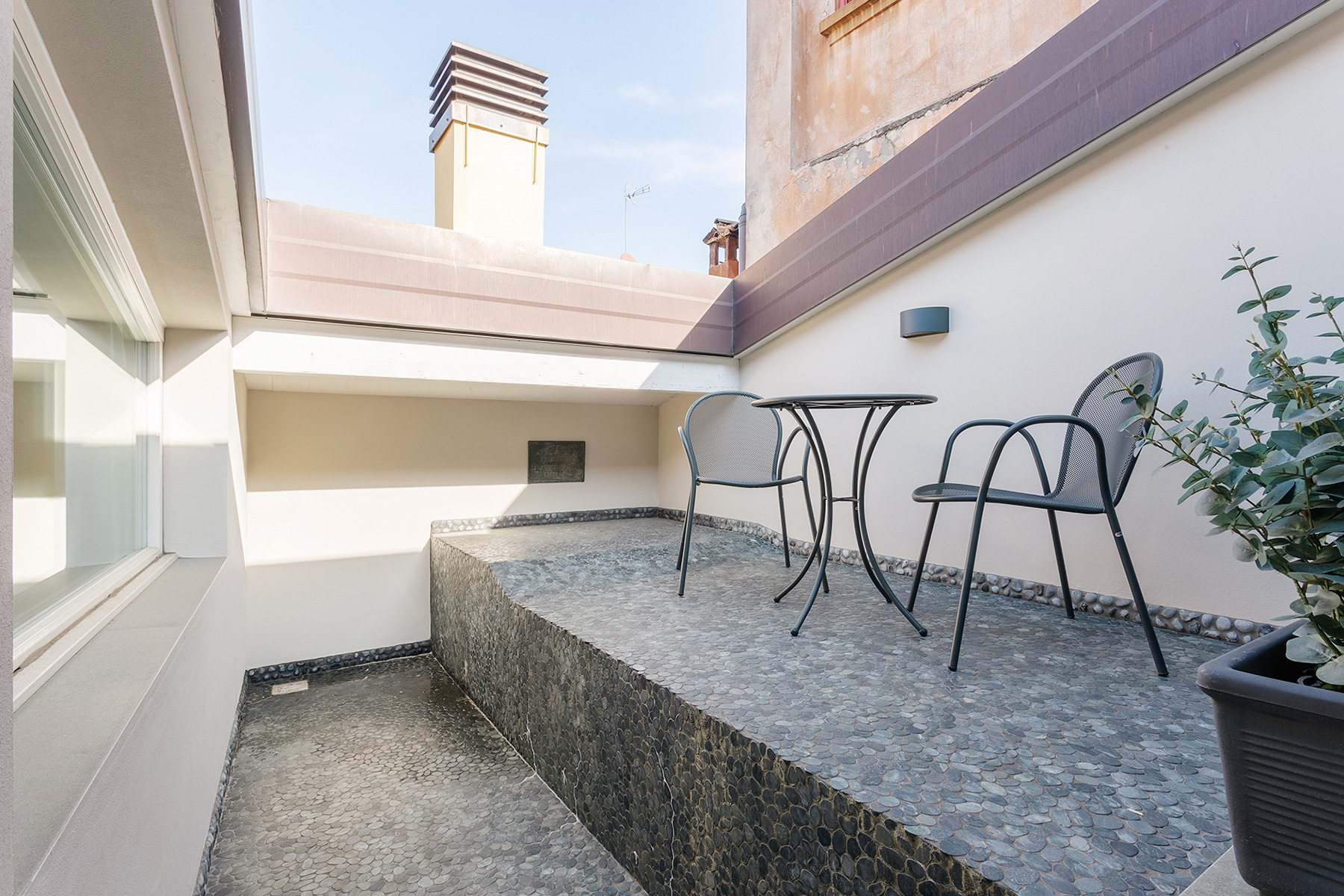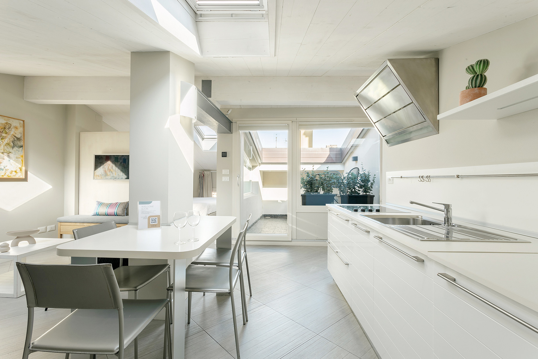 The living area consists of a living room with a sofa that can be easily turned into a comfortable double bed. The room is lit by a large French door leading to an unexpected hidden terrace overlooking the suggestive rooftops of Bologna.