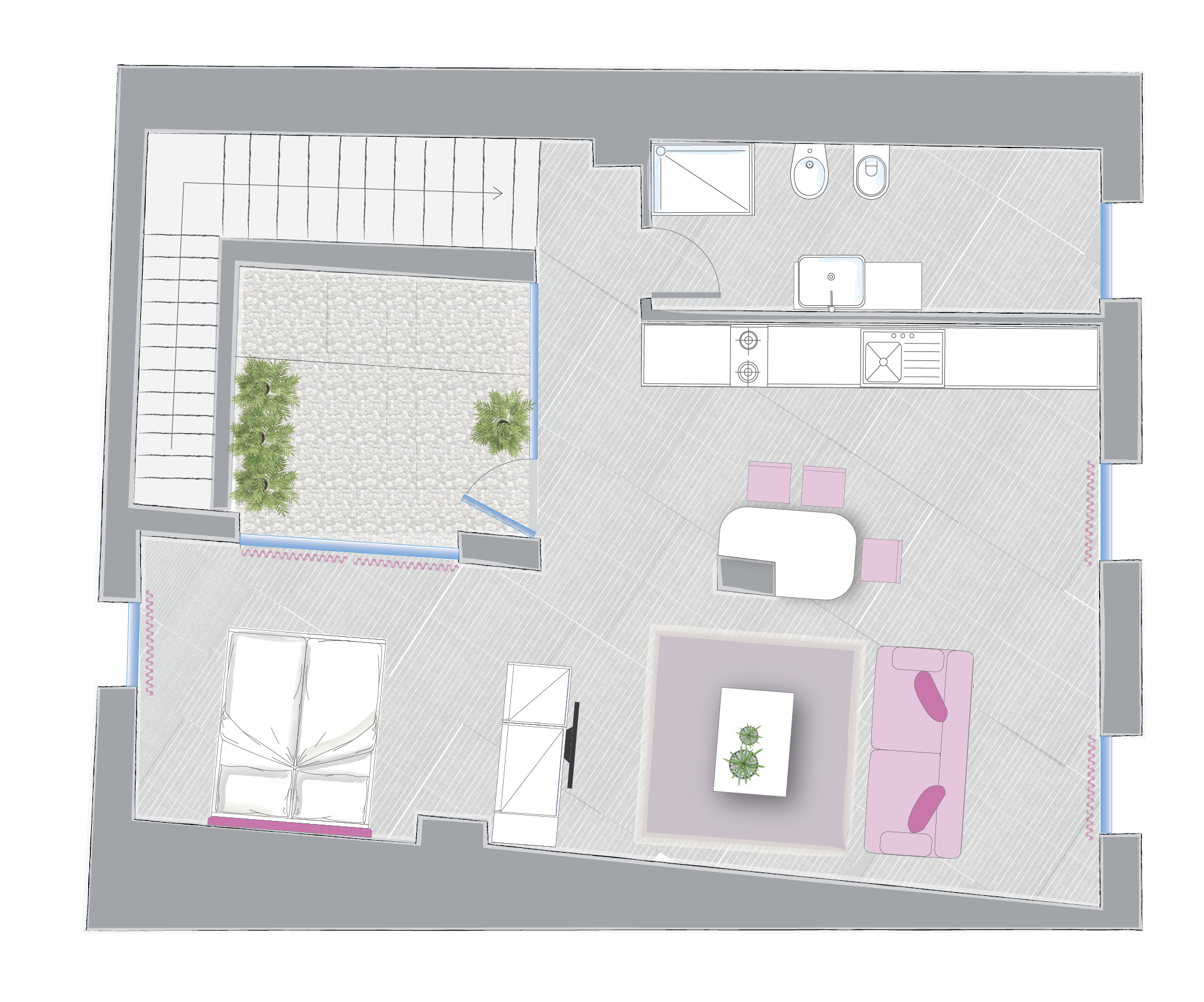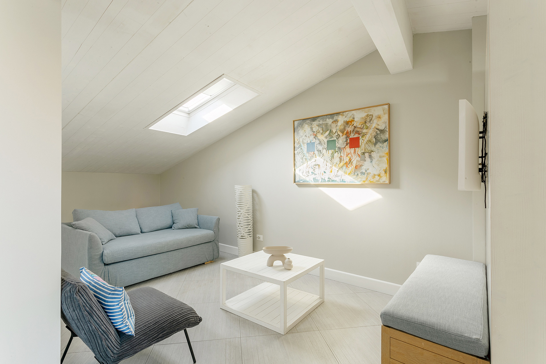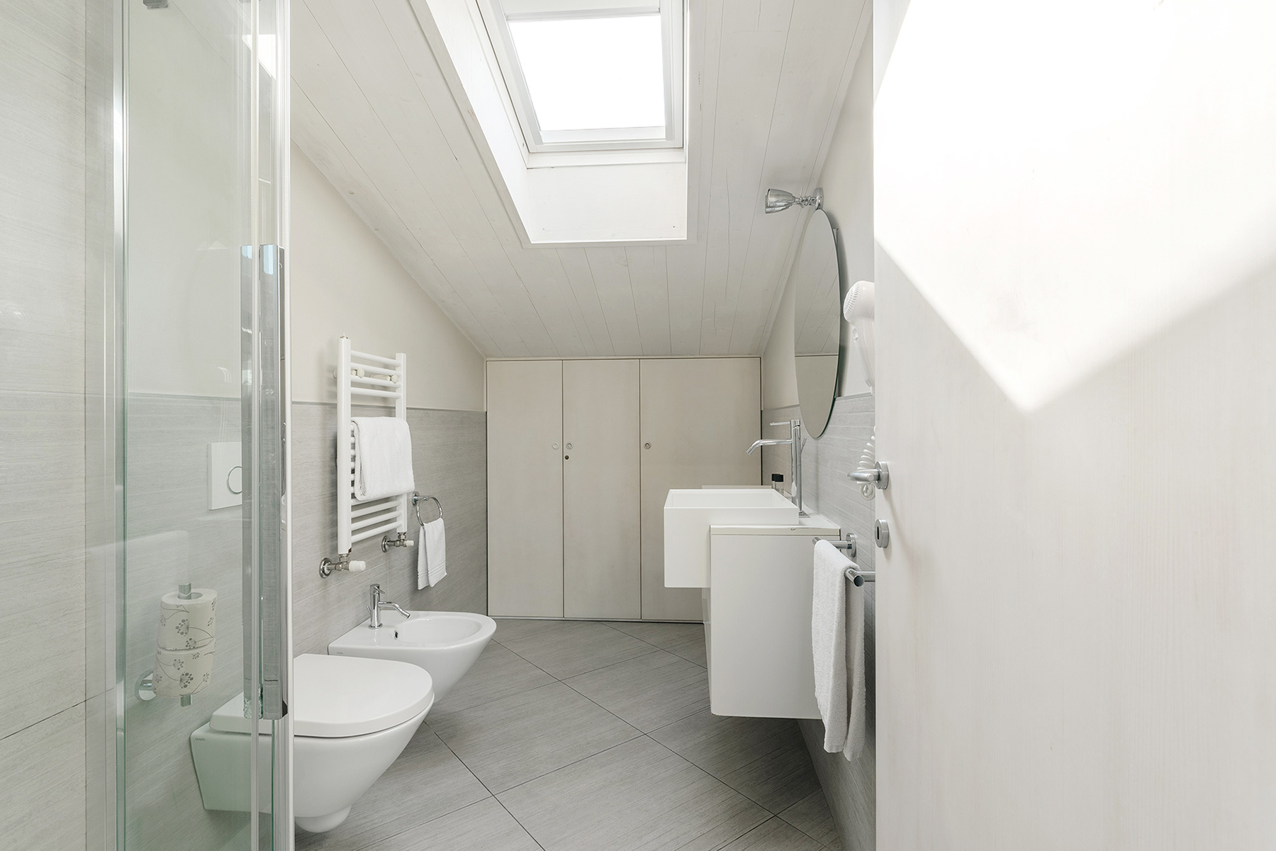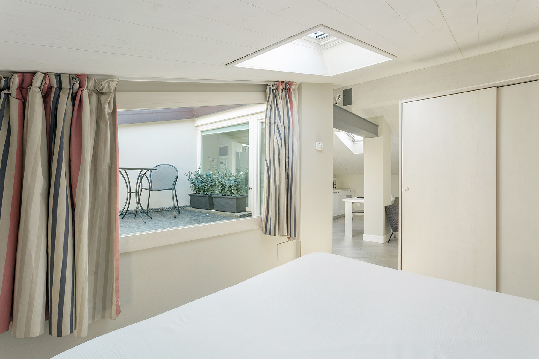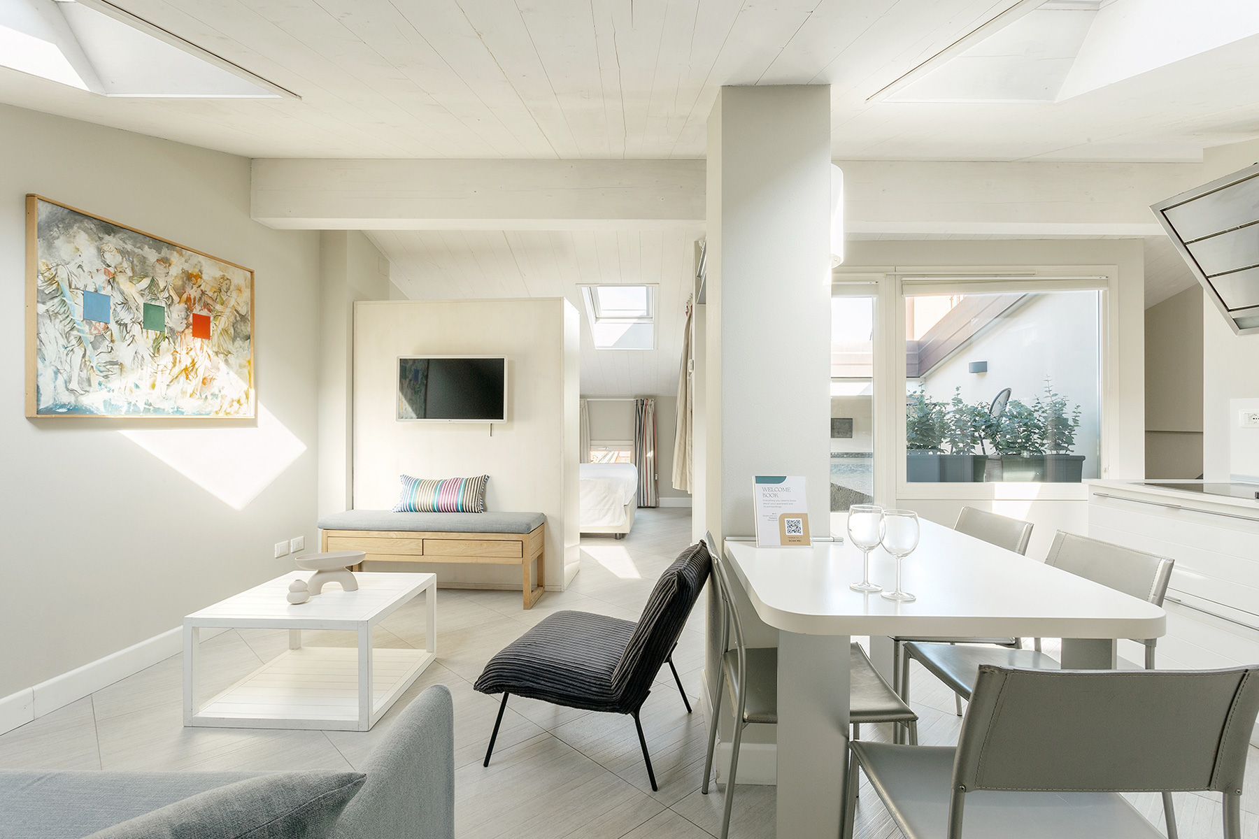 The living area consists of a living room with a sofa that can be easily turned into a comfortable double bed. The room is lit by a large French door leading to an unexpected hidden terrace overlooking the suggestive rooftops of Bologna.