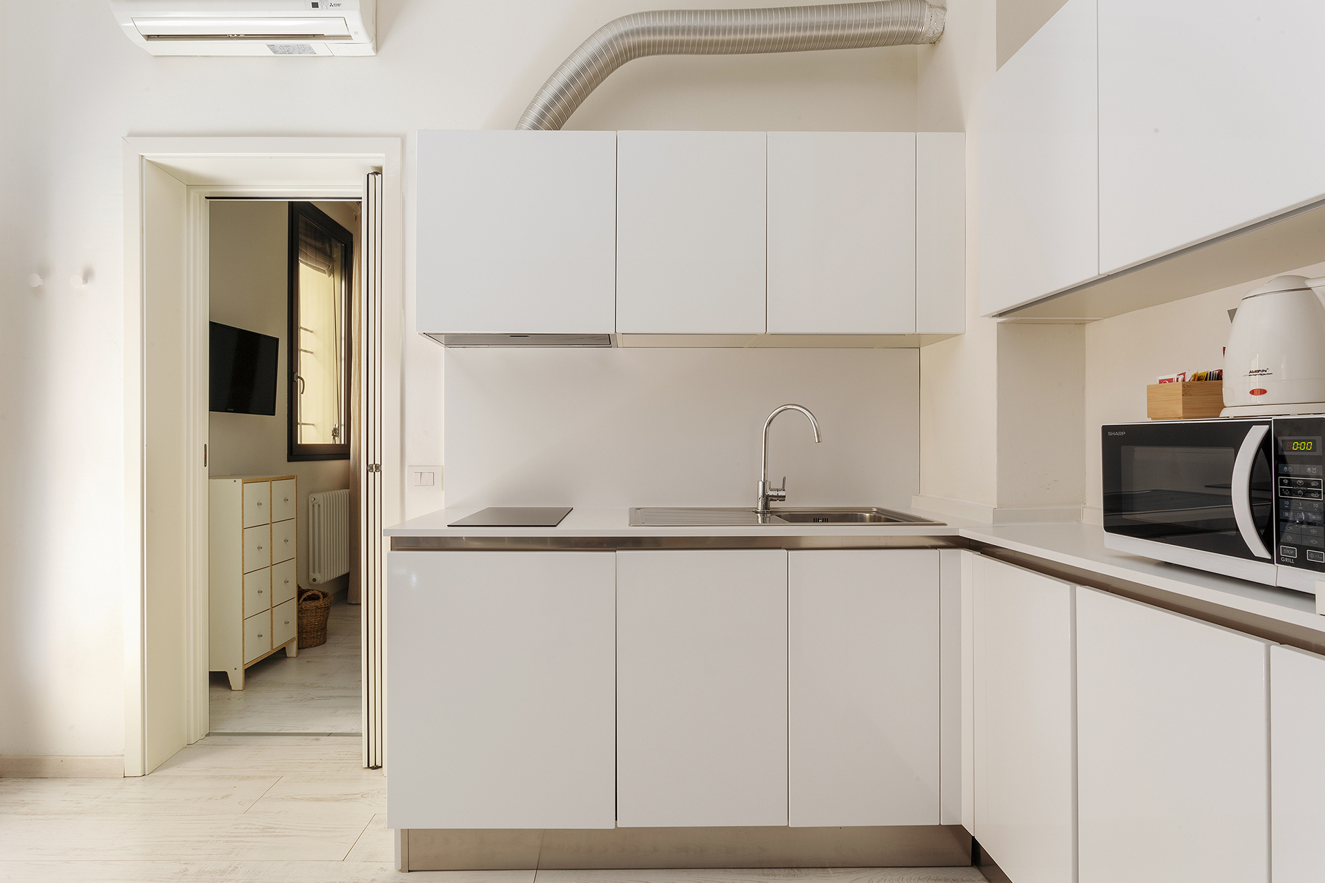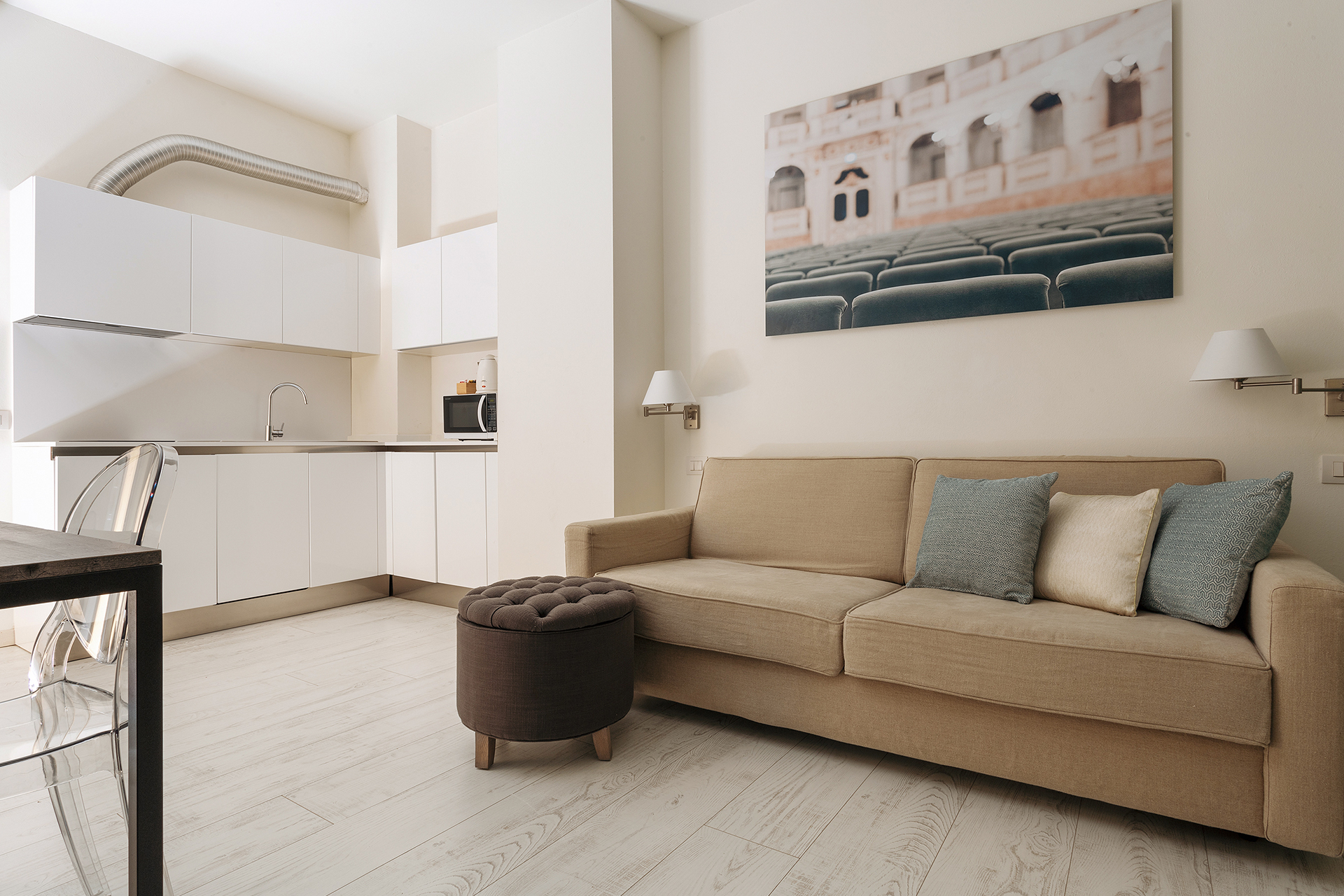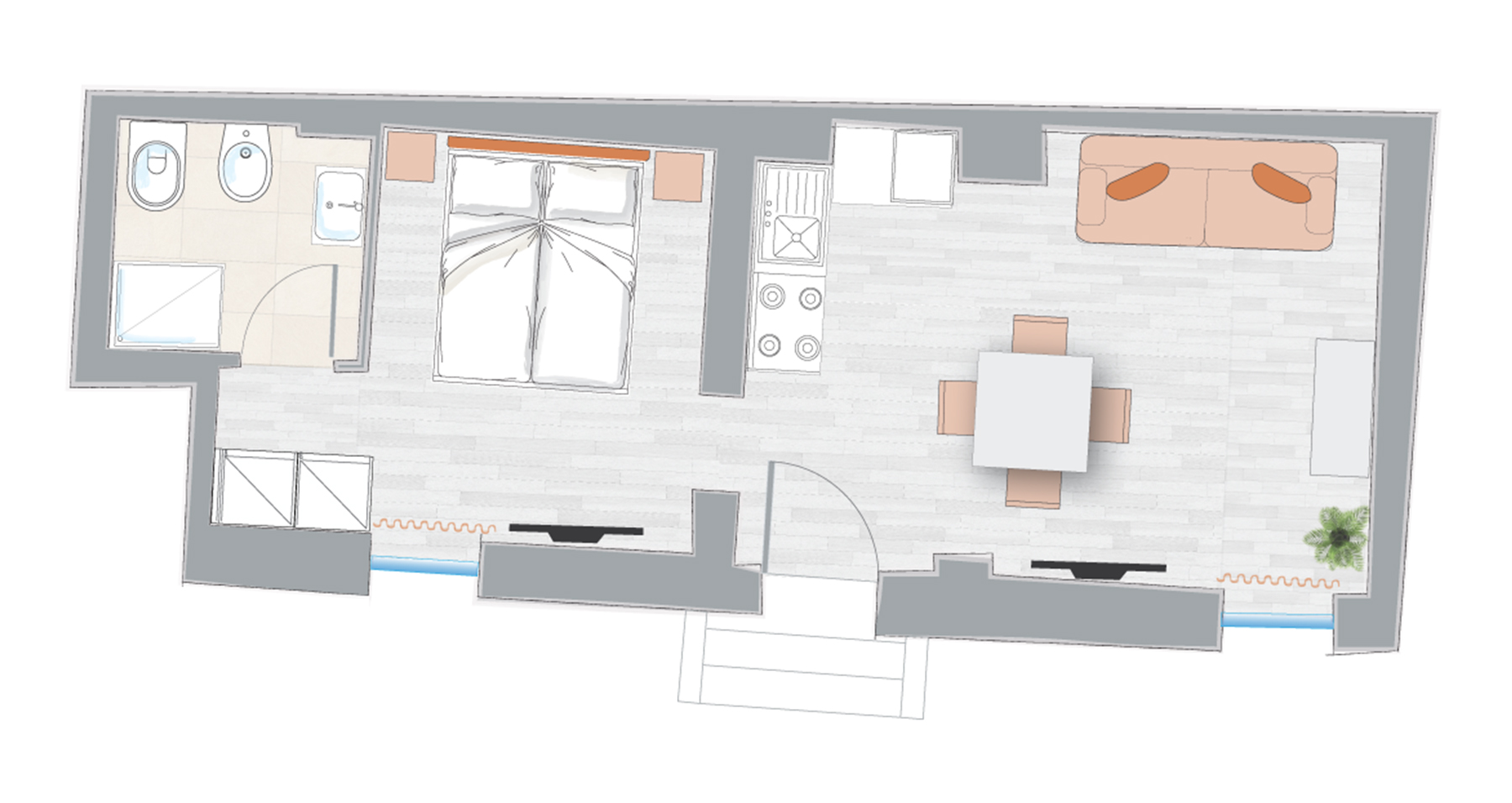This apartment is composed of a living room with a fully equipped kitchenette, a dinner table and a comfortable double sofa bed.