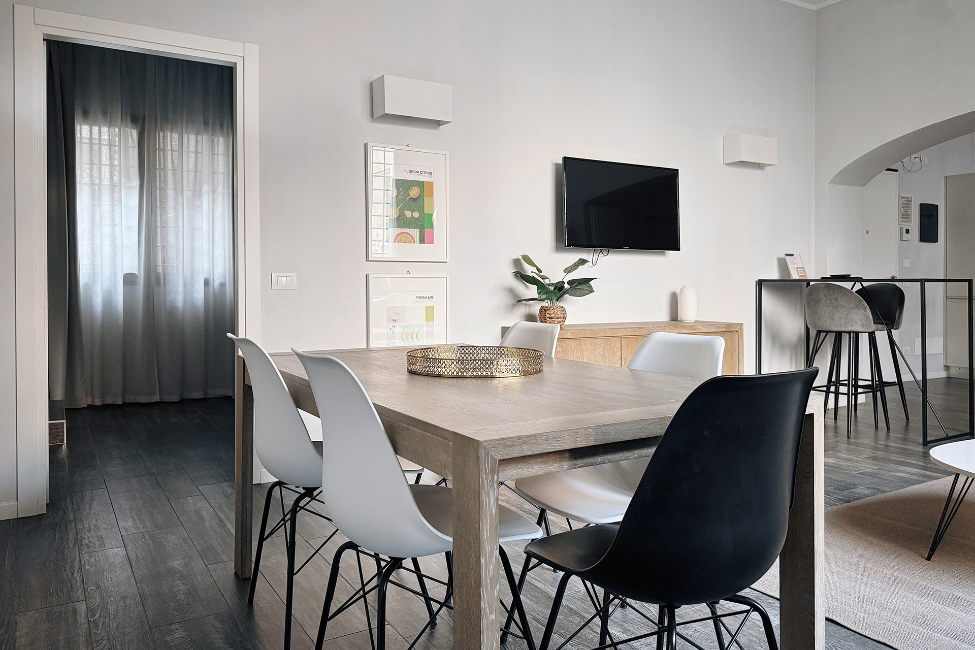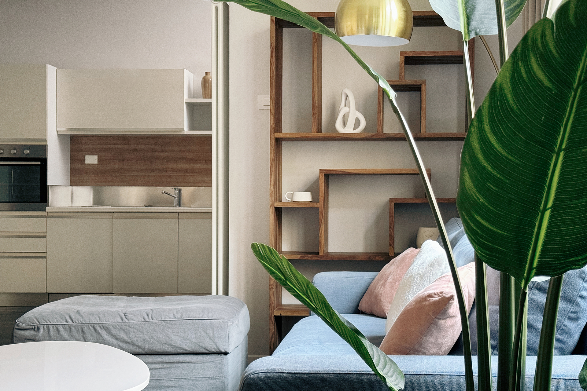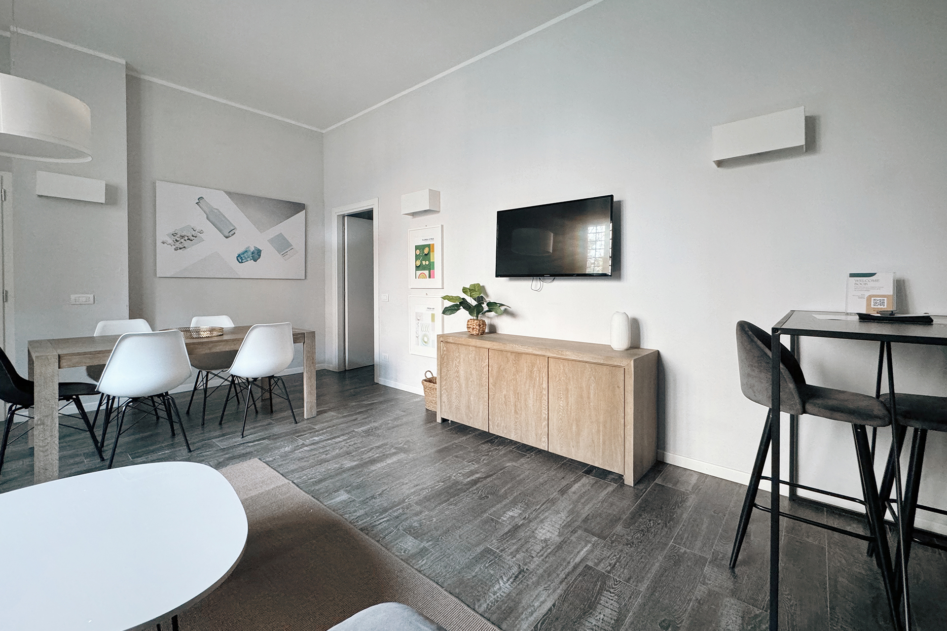 The living area features a living room with a double sofa bed and a dining table, and has wide windows overlooking a green internal courtyard, and there is a bathroom with shower as well. The kitchenette is equipped with induction cooktops, electric oven, refrigerator with freezer, microwave oven, dishwasher and electric kettle.