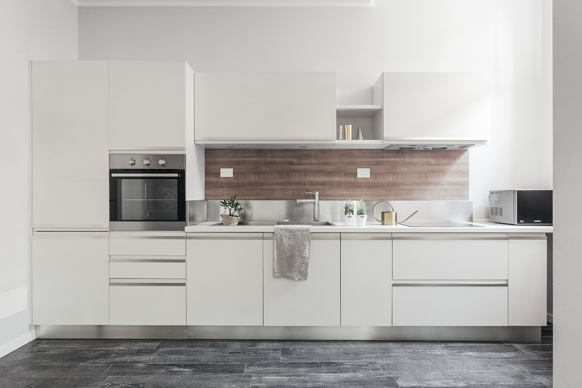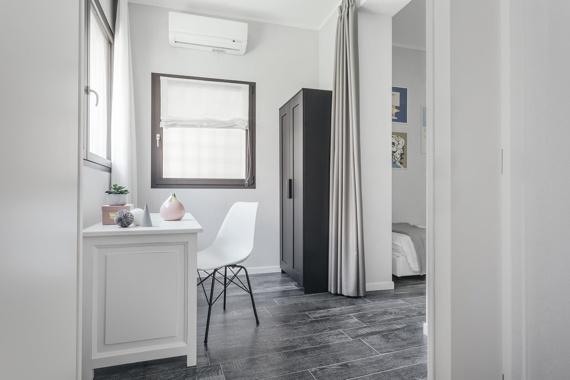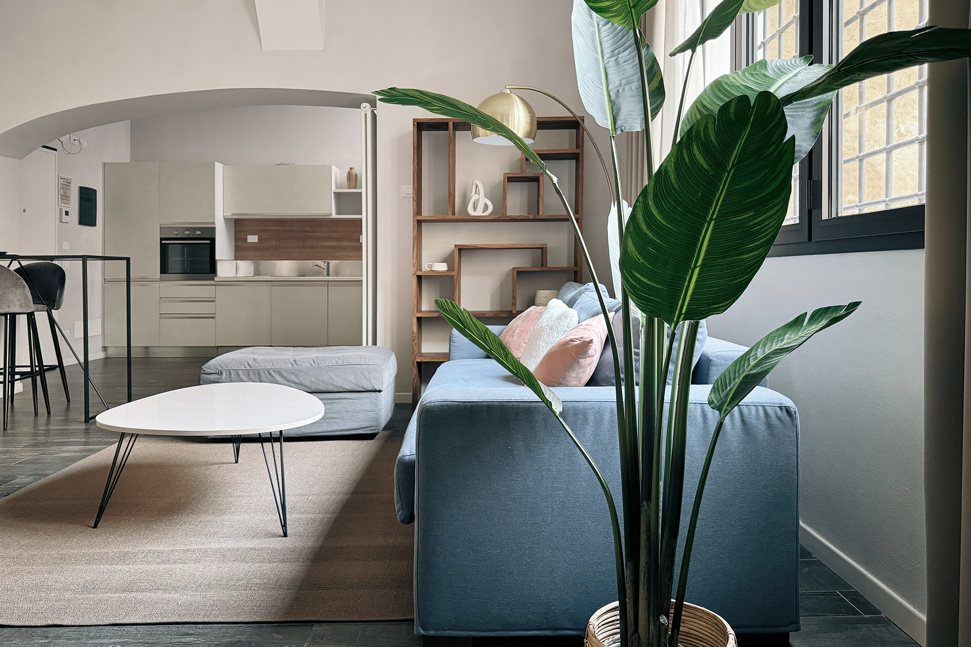 The living area features a living room with a double sofa bed and a dining table, and has wide windows overlooking a green internal courtyard, and there is a bathroom with shower as well. The kitchenette is equipped with induction cooktops, electric oven, refrigerator with freezer, microwave oven, dishwasher and electric kettle.