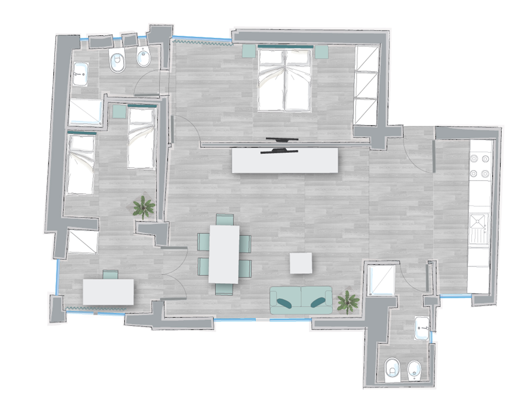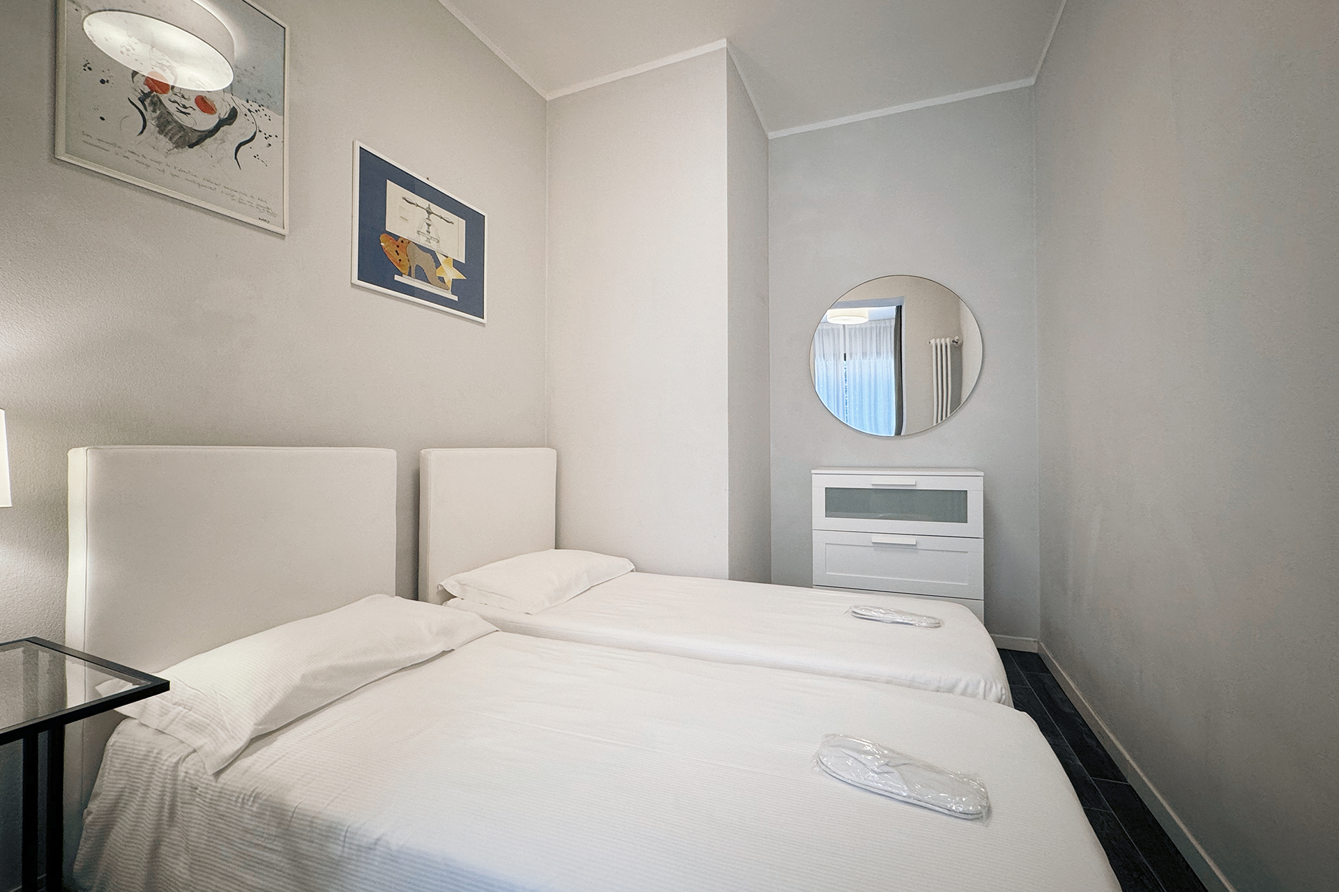 The sleeping area consists of a room with double bed and a second bathroom with shower, and another bedroom with two single beds.
