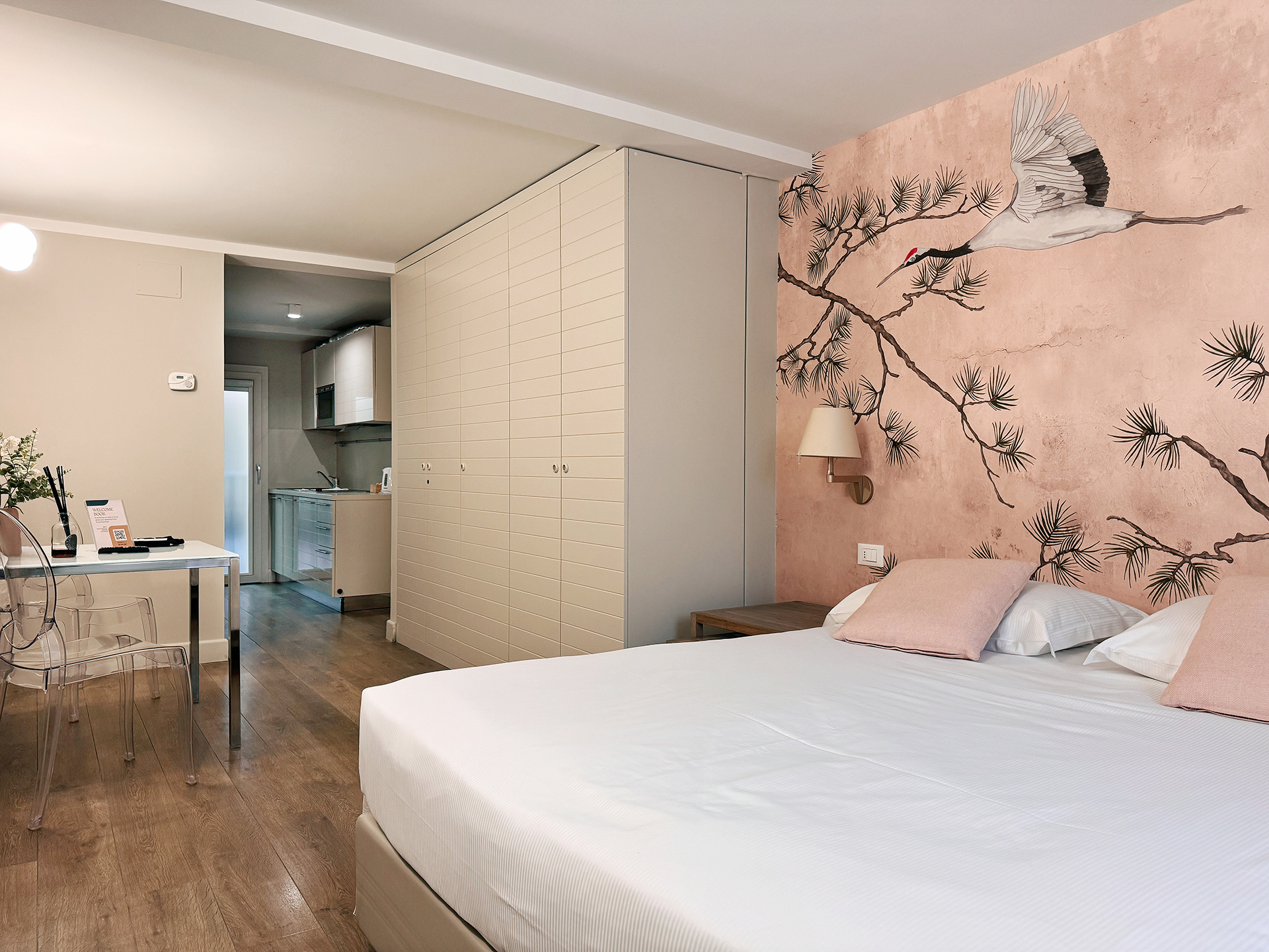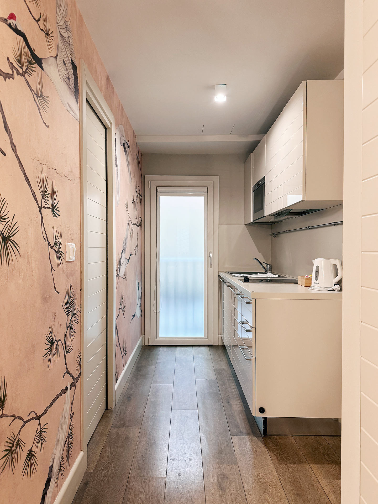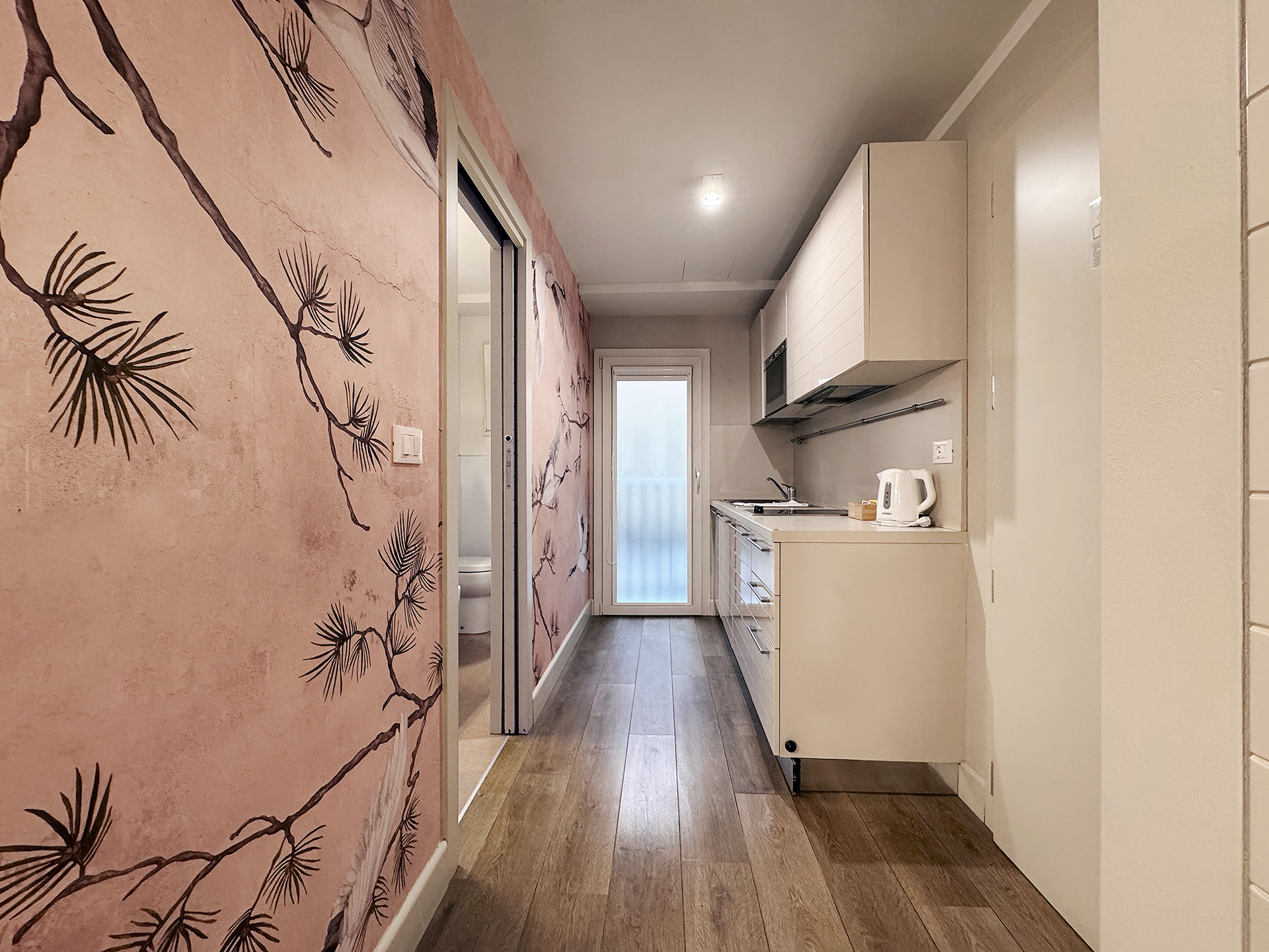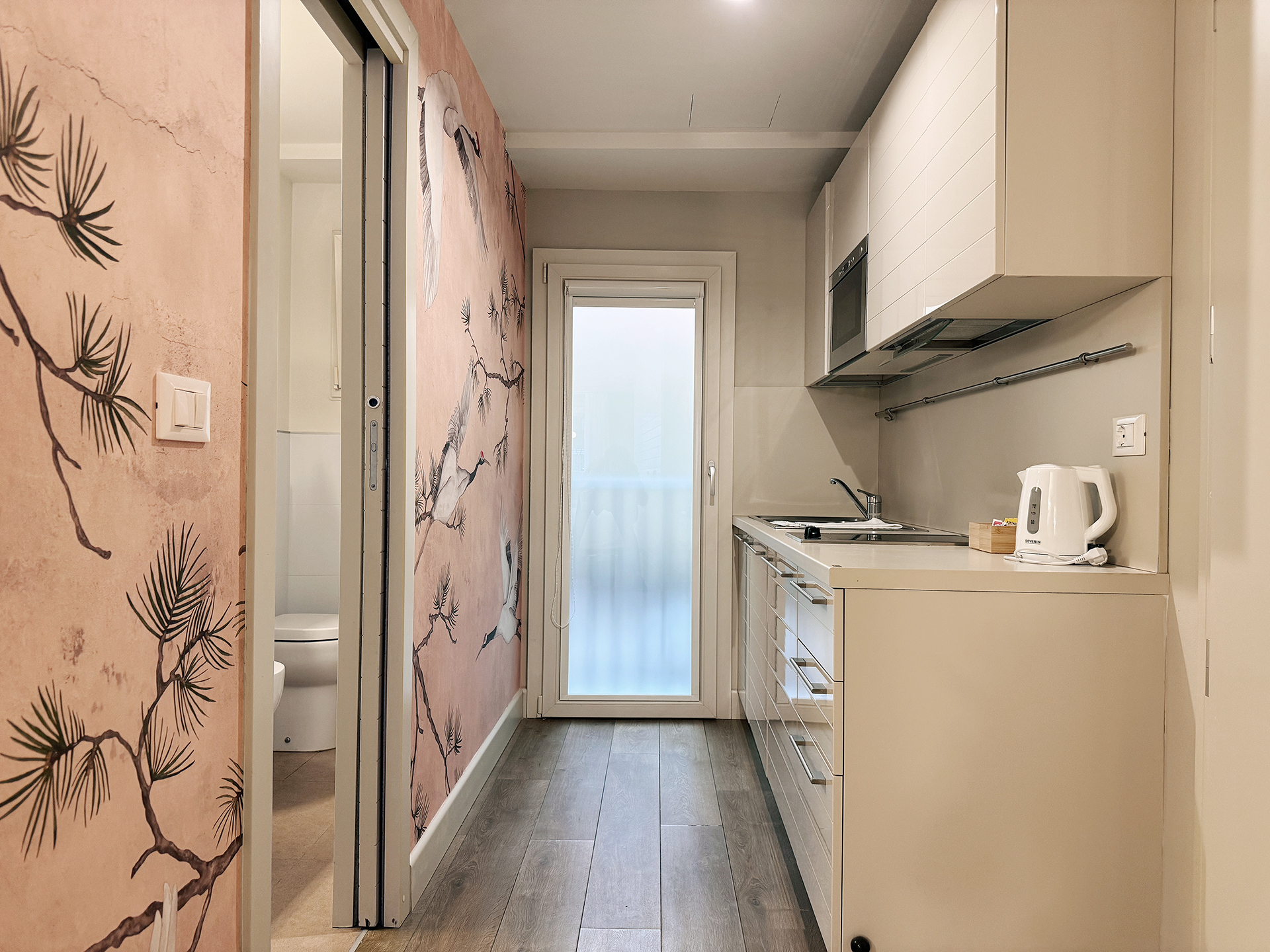 Splendido appartamento monolocale, situato al Residence Petronio in via Rizzoli 38, composto da un angolo cottura attrezzato con piastre a induzione, tavolo da pranzo, frigorifero, forno a microonde e bollitore elettrico.