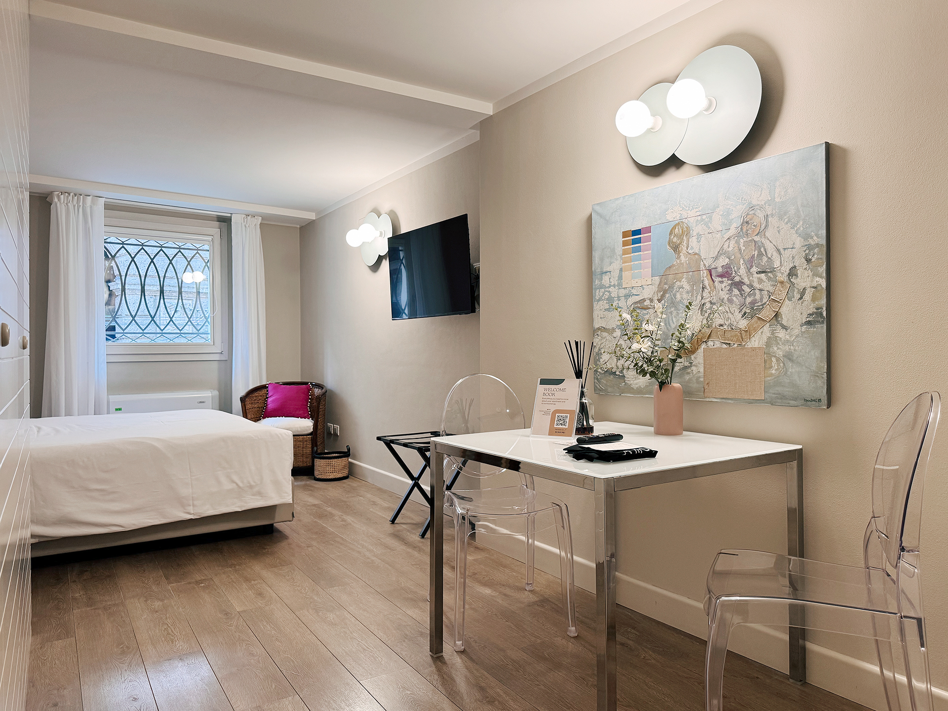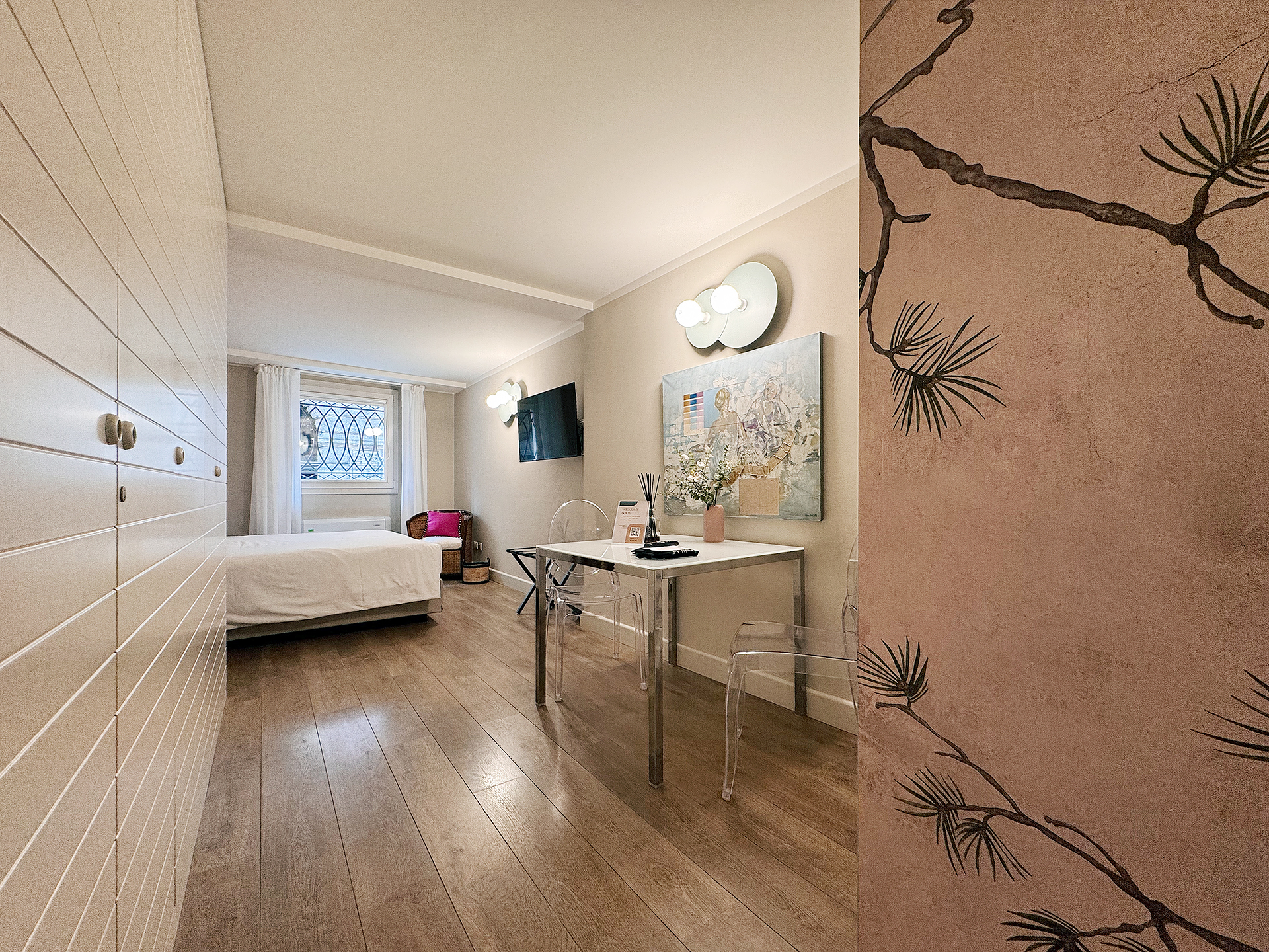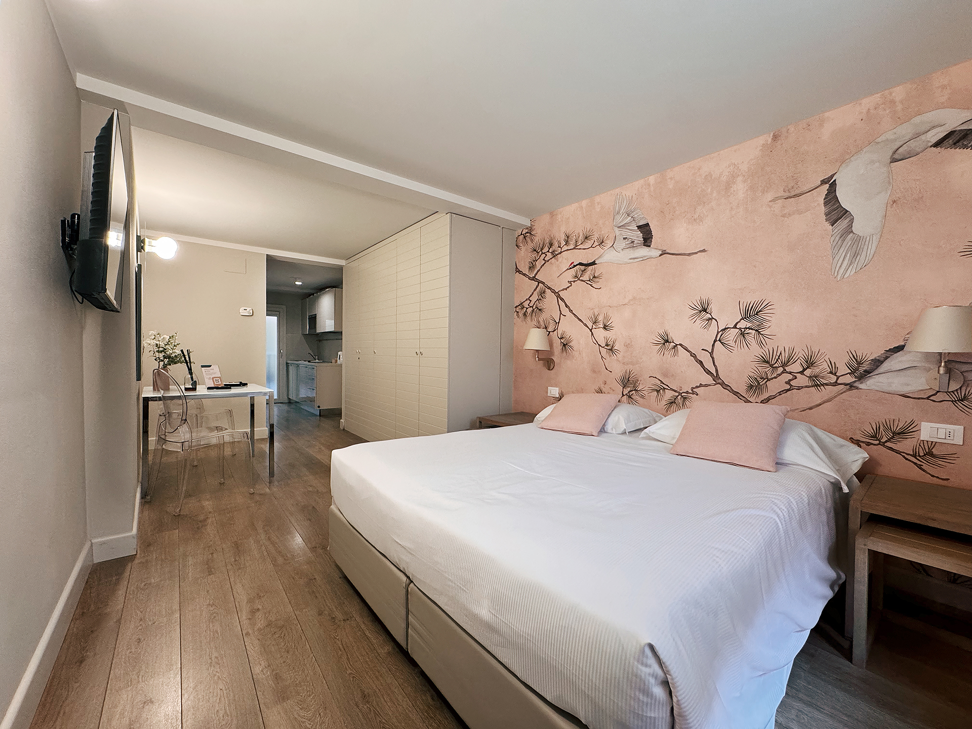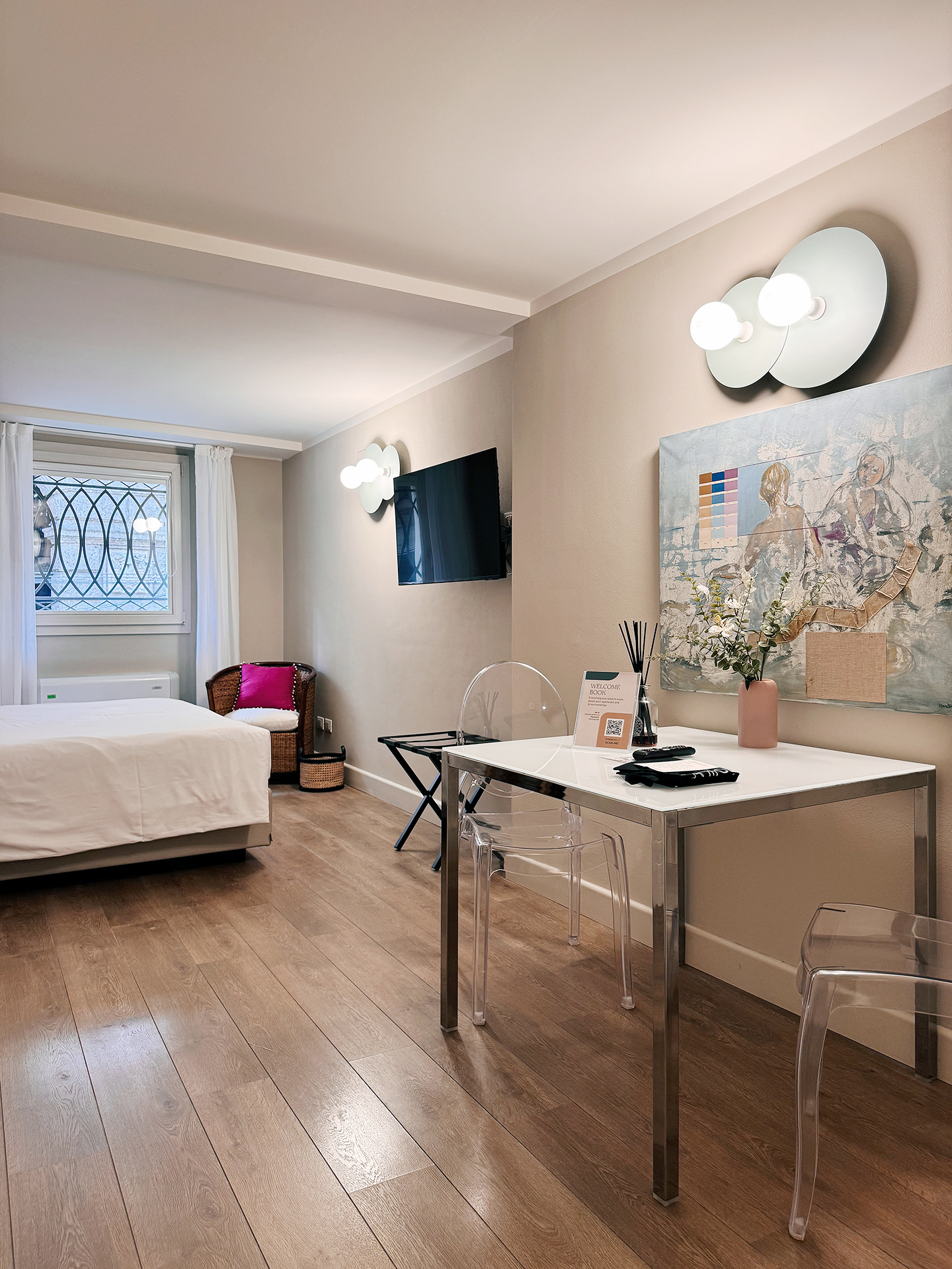 Splendido appartamento monolocale, situato al Residence Petronio in via Rizzoli 38, composto da un angolo cottura attrezzato con piastre a induzione, tavolo da pranzo, frigorifero, forno a microonde e bollitore elettrico.